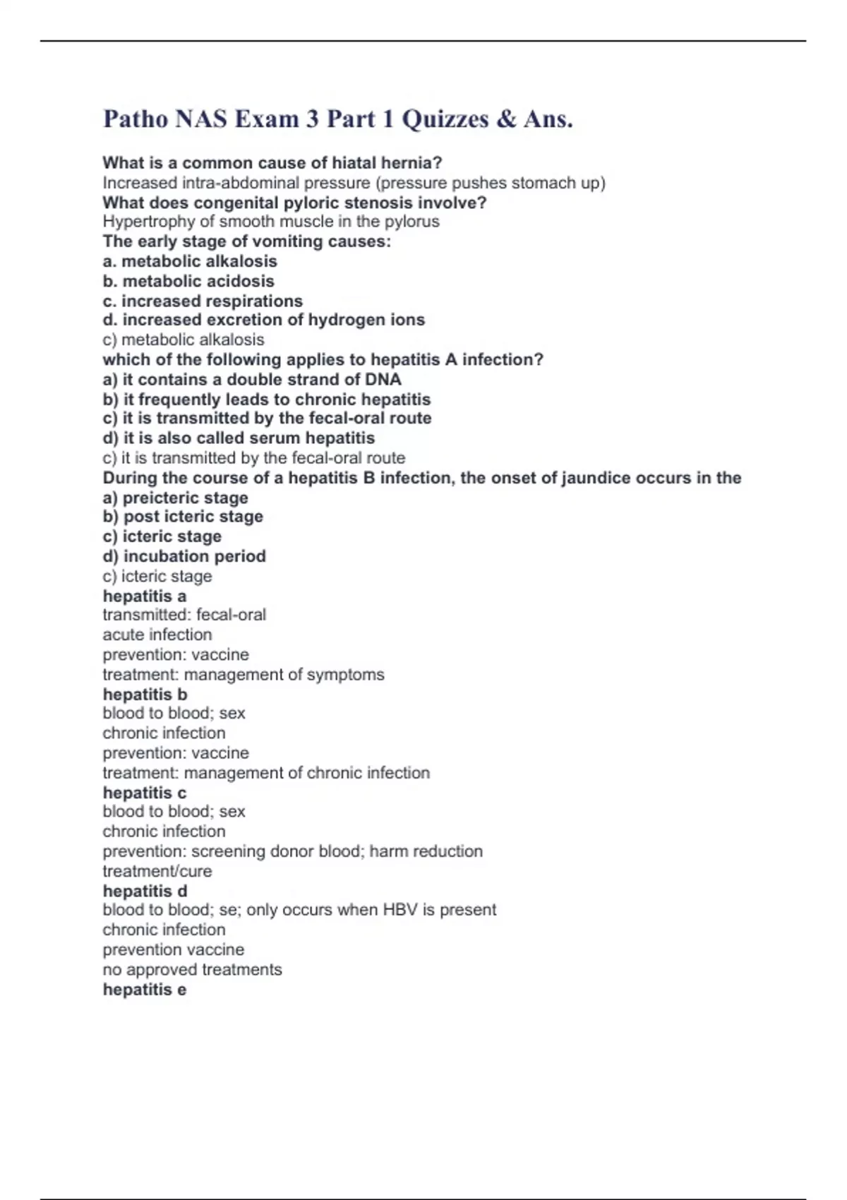 Patho NAS Exam 3 Part 1 Quizzes & Ans. What is a common cause of hiatal hernia? Increased intra-abdominal pressure (pressure pushes stomach up) What does congenital pyloric stenosis involve? Hypertrophy of smooth muscle in the pylorus The early stage of vomiting causes: a. metabolic alkalosis b. metabolic acidosis c. increased respirations d. increased excretion of hydrogen ions c) metabolic alkalosis which of the following applies to hepatitis A infection? a) it contains a double strand of DNA b) it frequently leads to chronic hepatitis c) it is transmitted by the fecal-oral route d) it is also called serum hepatitis c) it is transmitted by the fecal-oral route During the course of a hepatitis B infection, the onset of jaundice occurs in the a) preicteric stage b) post icteric stage c) icteric stage d) incubation period c) icteric stage hepatitis a transmitted: fecal-oral acute infection prevention: vaccine treatment: management of symptoms hepatitis b blood to blood; sex chronic infection prevention: vaccine treatment: management of chronic infection hepatitis c blood to blood; sex chronic infection prevention: screening donor blood; harm reduction treatment/cure hepatitis d blood to blood; se; only occurs when HBV is present chronic infection prevention vaccine no approved treatments hepatitis e
