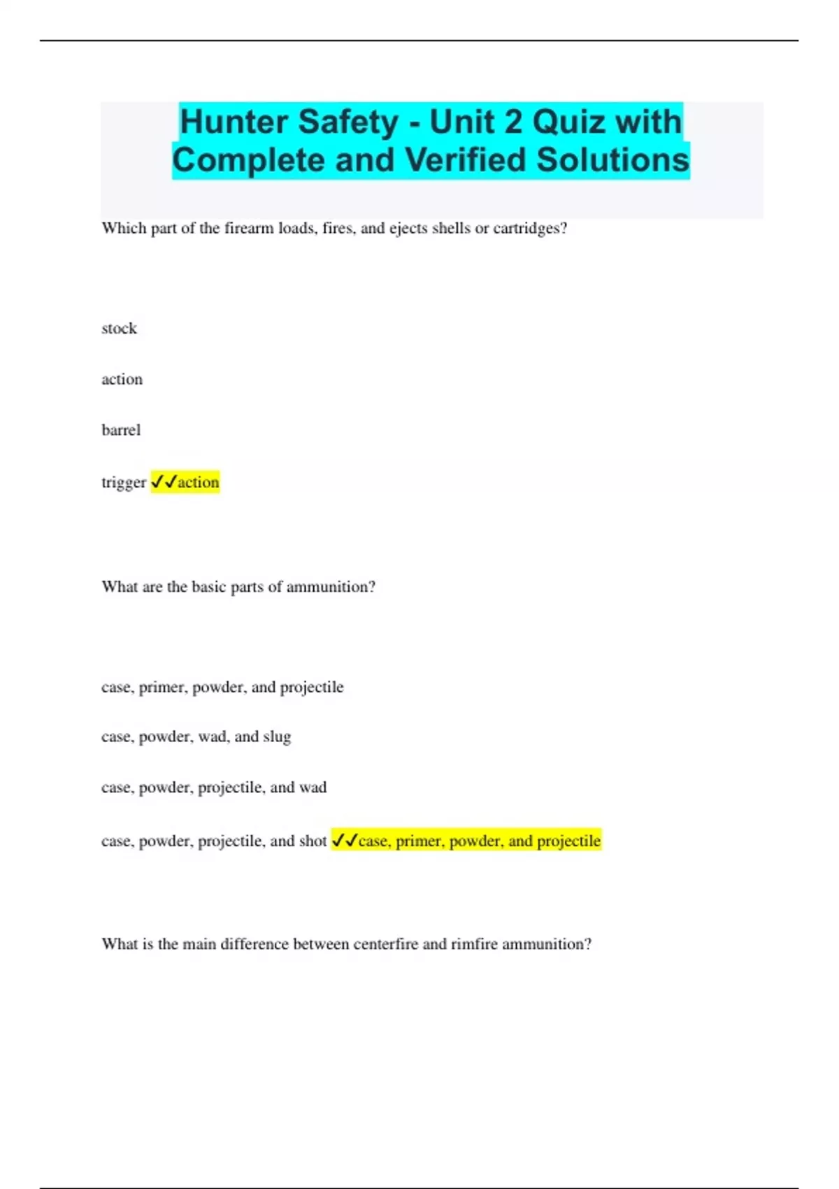 Hunter Safety - Unit 2 Quiz with Complete and Verified Solutions Which part of the firearm loads, fires, and ejects shells or cartridges? stock action barrel trigger action What are the basic parts of ammunition? case, primer, powder, and projectile case, powder, wad, and slug case, powder, projectile, and wad case, powder, projectile, and shot case, primer, powder, and projectile What is the main difference between centerfire and rimfire ammunition? Centerfire ammunition is used for muzzleloaders. Centerfire ammunition is limited to low pressure loads. Rimfire cartridges are reloadable. Rimfire primer is in the rim of the casing. Rimfire primer is in the rim of the casing. Choose the true statement about steel shot versus lead shot. Steel shot weighs about two-thirds as much. Steel shot produces a larger pattern. Steel shot is softer. Steel shot is more unstable in flight. Steel shot weighs about two-thirds as much. When a rifle fires, a sequence of events takes place. After the firing pin strikes the primer, what is the next event in the sequence? Expanding gas drives the bullet through the barrel. Gunpowder burns and converts to a gas. The trigger is pulled. The primer explodes and sparks the gunpowder. The primer explodes and sparks the gunpowder. Which statement is true about fully-automatic firearms? A fully-automatic may not be used for hunting. On a fully-automatic, the trigger must be pulled each time a shot is fired. A semi-automatic may not be used for sport shooting. On a semi-automatic, firing is continuous as long as the trigger is held down. A fully-automatic may not be used for hunting. To make sure a bolt-action firearm is unloaded, you must check the: magazine and trigger open action and magazine open action and muzzle muzzle and trigger open action and magazine A firearm safety: is intended for use only by inexperienced hunters is foolproof can prevent all accidental shootings can be bumped from the safe position can be bumped from the safe position Which type of sight is most accurate and give the best view of the target? telescopic bead open aperture (peep) telescopic ______ is a term that describes the size of a rifle or handgun bore. This term also describes the size of cartridges used with different bores. gauge caliber shot charge action caliber Rifles, shotguns, and handguns differ mostly based on their: barrels and ammunition barrels and safeties actions and stocks actions and ammunition barrels and ammunition Each rifle or handgun is designed to be used with a specific type of: cartridge shotshell gauge choke cartridge Shotguns are classified by: caliber bore choke gauge gauge A 20-gauge shell is placed in a 12-gauge shotgun. What is the danger? The shotgun will not fire. The shot will not fly true, causing the hunter to miss the target. The shell could lodge in the barrel and cause serious personal injury. The shell could cause a misfire. The shell could lodge in the barrel and cause serious personal injury. Which of the following statements is true? When a hang fire or misfire happens, immediately eject the cartridge or shell to clear the chamber. Magnum loads should be fired occasionally in all firearms to clean out the barrel. A hang fire is when the primer fails to ignite the powder. Never carry more than one caliber or gauge of ammunition at the same time. Never carry more than one caliber or gauge of ammunition at the same time. What might cause a shotgun to explode? a misfire insufficient gunpowder in the shotshell using the wrong choke for your quarry using the wrong shotshell in your shotgun using the wrong shotshell in your shotgun When you know a firearm's effective killing range, you can determine: which animals you can hunt which stance to use when shooting whether you are aiming at the target when a shot will give a clean kill when a shot will give a clean kill Choose the true statement about a firearm's maximum projectile range. Knowing a firearm's range is critical only when firing a shotgun. Knowing a firearm's range is critical only when firing a rifle or handgun. When you know a firearm's range, you know how far the bullet or shot can travel and still cause injury. When you know a firearm's range, you know how close you need to be to hit your target every time. When you know a firearm's range, you know how far the bullet or shot can travel and still cause injury. What is the first step in cleaning a firearm? Clean from the breech end. Point the muzzle in a safe direction. Field strip the firearm. Use cleaning solvents in a well-ventilated area. Point the muzzle in a safe direction. Which of the following would be a good spot to store ammunition? a warm, humid location a cool, dry location an unlocked case a paper bag a cool, dry location
