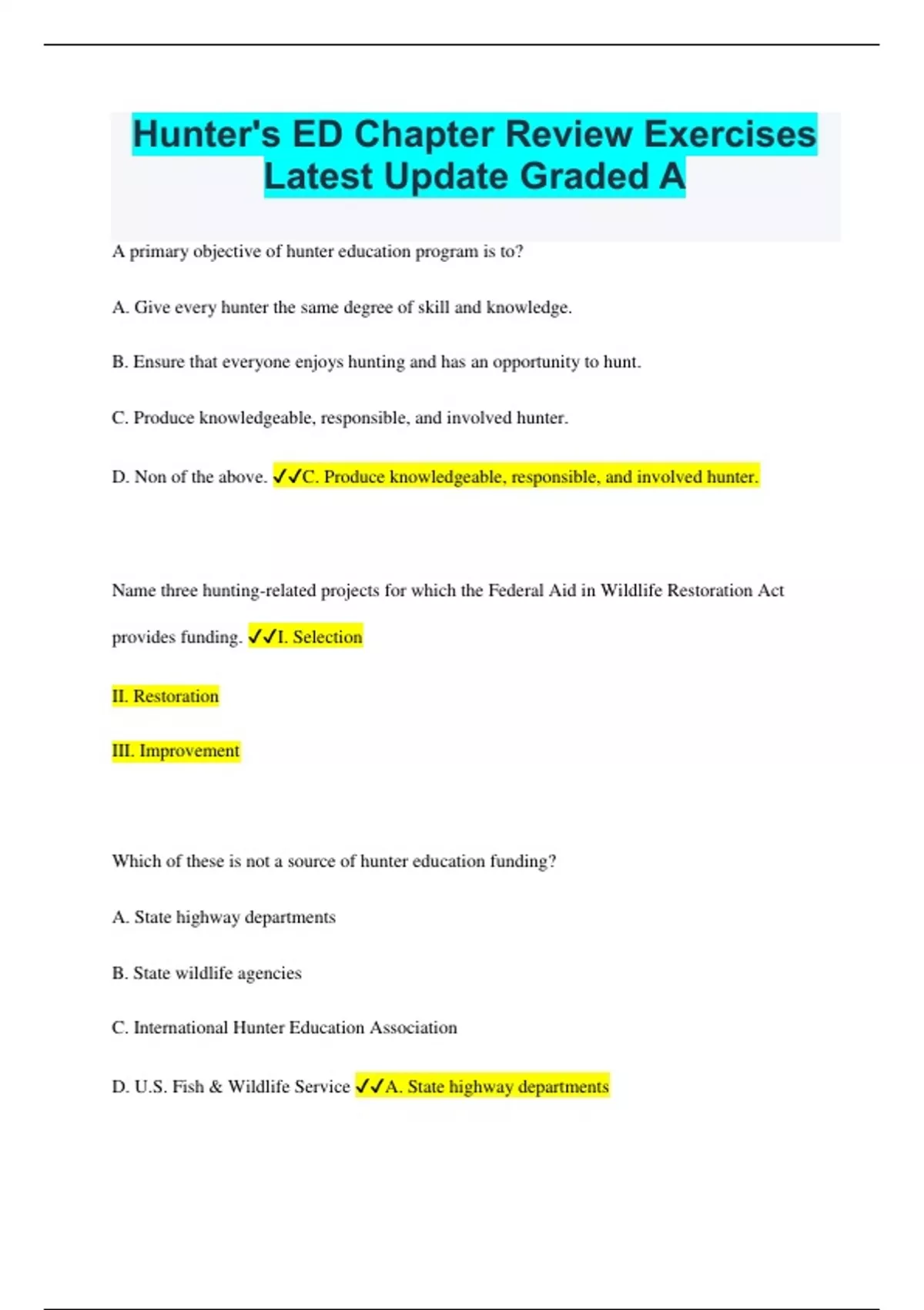 Hunter's ED Chapter Review Exercises Latest Update Graded A A primary objective of hunter education program is to? A. Give every hunter the same degree of skill and knowledge. B. Ensure that everyone enjoys hunting and has an opportunity to hunt. C. Produce knowledgeable, responsible, and involved hunter. D. Non of the above. C. Produce knowledgeable, responsible, and involved hunter. Name three hunting-related projects for which the Federal Aid in Wildlife Restoration Act provides funding. I. Selection II. Restoration III. Improvement Which of these is not a source of hunter education funding? A. State highway departments B. State wildlife agencies C. International Hunter Education Association D. U.S. Fish & Wildlife Service A. State highway departments Name three behaviors of a responsible hunter. Attitude, Skills, and Knowledge The three basic parts of a modern firearm are______. A. cartridge, stock, and barrel. B. action, stock, and barrel. C. Stock, trigger, and action D. Barrel, Chamber, and muzzle. C. Stock, trigger, and action Label the indicated parts of a bolt-action rifle: I. Butt II. Sight III. trigger IV. Muzzle the component in ammunition that ignites the gunpowder when struck by the the firing pin is the ___________. Primer The action of a firearm is made up of parts that __________. A. block the trigger or hammer to prevent accidental firing. B. hold ammunition before it's loaded into the chamber. C. load, unload, fire, and eject the cartridge or shot shell. D. serve as the handle of the firearm. C. load, unload, fire, and eject the cartridge or shot shell. You should use only ammunition that exactly matches the caliber or gauge specifications marked on the ___________ of your firearm. barrel label the indication parts of the rifle and shotgun ammunition: I. Bullet II. Shot III. Gunpowder IV. Primer List six types of firearm actions. I. Bolt Action II. Lever Action III. Pump Action IV. Semi-Automatic V. Break Action IV. Revolting Action A safety is located around the receiver of the firearm and ______. A. ensures that the firearm can never be accidental fired. B. is a device that blocks the action to prevent accidental firing. C. is always located either inside or on the trigger guard. D. all of the above. B. is a device that blocks the action to prevent accidental firing. The most accurate sight for a firearm is the ___________. Telescopic The design feature that causes a bullet to spiral, which increases accuracy and distance, is called ________________. Rifling ___________________
