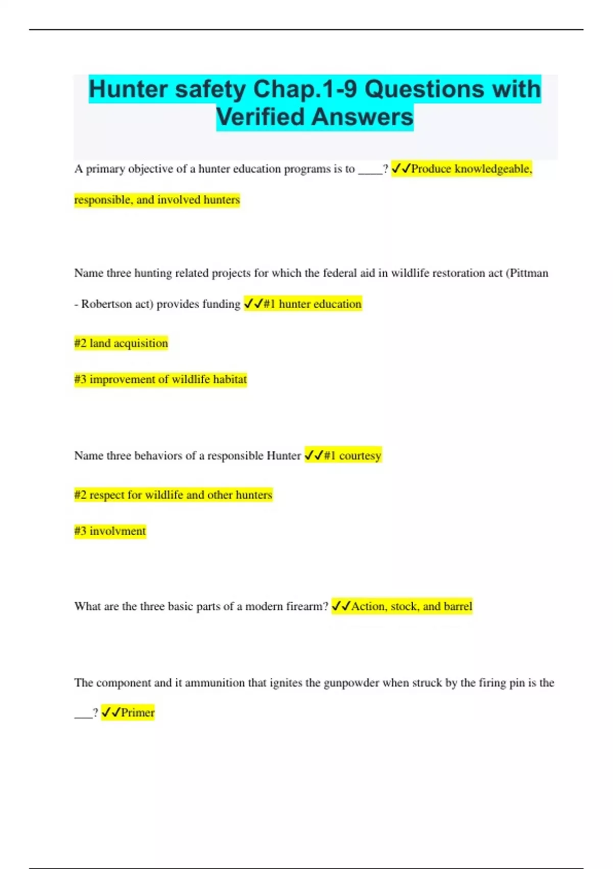 Hunter safety Chap.1-9 Questions with Verified Answers A primary objective of a hunter education programs is to ____? Produce knowledgeable, responsible, and involved hunters Name three hunting related projects for which the federal aid in wildlife restoration act (Pittman - Robertson act) provides funding #1 hunter education #2 land acquisition #3 improvement of wildlife habitat Name three behaviors of a responsible Hunter #1 courtesy #2 respect for wildlife and other hunters #3 involvment What are the three basic parts of a modern firearm? Action, stock, and barrel The component and it ammunition that ignites the gunpowder when struck by the firing pin is the ___? Primer The action of a fire arm is made up of parts that____? Load, unload, fire and eject the cartridge or shotshell You should use only ammunition that exactly matches the caliber or gauge specification marked on the ___ of your firearm Side What are the parts in the cartridge? Bullet, gunpowder, primer What are the parts in a shot shell? Shot, gunpowder, primer List six types of firearm actions Bolt, pump, semi automatic, lever, break, revolving A safety is located around the receiver of the fire and ___? Located on either side of the trigger guard What is the most accurate site for fire arm? Telescopic What design feature causes a bullet to spiral which increases accuracy and distance? Grooves ___ is a measure related to the diameter of the bore in the size of the shotshell designed for that bore Guage When referring to firearms, "caliber" is___? Used to describe the size of a rifle bore in the size of the cartridges designed for different bores List the most common shotgun chokes Full, modified, improve cylinder, cylinder Steel shot is___? Harder than lead, keeping the pattern tighter Knowing your firearms range is critical - it allows you to___ Know at what distances your firearm can cause injury and determine whether or not you're able to make a clean kill or not Why is it important to keep shotshells separated by size? A smaller gauge shotshell can slip past the chamber of a larger gauge gun and result in serious personal injury Fire arm should be stored___, in a___location, in separated from___ your firearm should be stored all moved in, in a locked location, and separated from ammunition Good marksmanship is___ Hitting your target accurately and consistently Sight alignment is the_____ The process of lining up rear in front sights To help you steady the rifle when you're ready to shoot, draw a deep breath and_____ Release about half of your air The proper technical pulling the trigger when firing a rifle is to____ Squeeze the trigger Of the four standard rifle - firing positions the steadiest is the_____position Prone All handguns should be fired up____length Arms If you were hunting small, fast, close birds, the best choke selection would be____or___choke Improved or modified choke When patterns a shotgun, the goal is to produce a pattern of pellets with even___and sufficient percentage of the___within a 30 inch circle Density and load Which shotgun - shooting technique is best for a beginning hunter it is performed by pointing at a moving target and then moving past it and firing Swing - through A common error when hunting birds with a shotgun is____ Lowering the head and the cheek to the stock of the shotgun It is critical that you know about the game you're hunting because Only one sex of the game you're hunting maybe legal, there may be protected species in the same area that you need to avoid shooting, it will increase your chance of success List the four basic characteristics used for animal Movement, sound, behavior, marking Unlike still hunting, stocking involves... Following signs left by the animal ___Is a hunting technic that involves a group of hunters who are spread out and moved to push the game towards other hunters waiting at the end of the cover Driving A true sportsman not only strive to bring home the games you are she is seeking but also strive to___the quarry Inflict the minimal amount of suffering on the quarry The most effective place to shoot an animal is the vital organs which are Lungs and heart A____shot is the preferred shot for the larger game animals such as deer, elk, and bear Broadside When approaching it down there or other large animal you should Pause above and behind the animals head and watch the chest cavity for any movement Once you are sure your quarry is done you should immediately do what before beginning field dressing Tag it What would not contribute to meat spoiling The cold What is the only type of powder that should be used in Black powder An unsafe practice when using a muzzleloader Loading directly from a horn or flask or any other containers How many charges should you load in a muzzleloader at a time One charge Name the three common now types Long bow, recurve bow, compound bow Name the four parts of an arrow The nock, The fletching, the shaft, the arrowhead What arrowhead is primarily used for big-game hunting Mechanical blade broadheads A good safety rule to follow when shooting a bow is to Release and arrow only when the path to the target and beyond is clear To minimize the risk of a firearm incident in the home you should never do what Store the fire arms and ammunition together Name the four main causes of hunting incidents Judgment mistakes, safety rule violations, lack of control and practice, mechanical failure If 3 hunter are walking side-by-side the Hunter in the center should keep the gun pointing To the side or up If three hunters are walking in a single file it is acceptable for the Hunter in the middle to use the what Elbow or side carry If crossing offense will hunting alone, you should always do what Place the gun on the other side of the fence with the muzzle pointing away from you and then cross To load or unload a firearm safety you should always do what Put the safety on and point the muzzle in a safe direction What is not a safe way to transfe