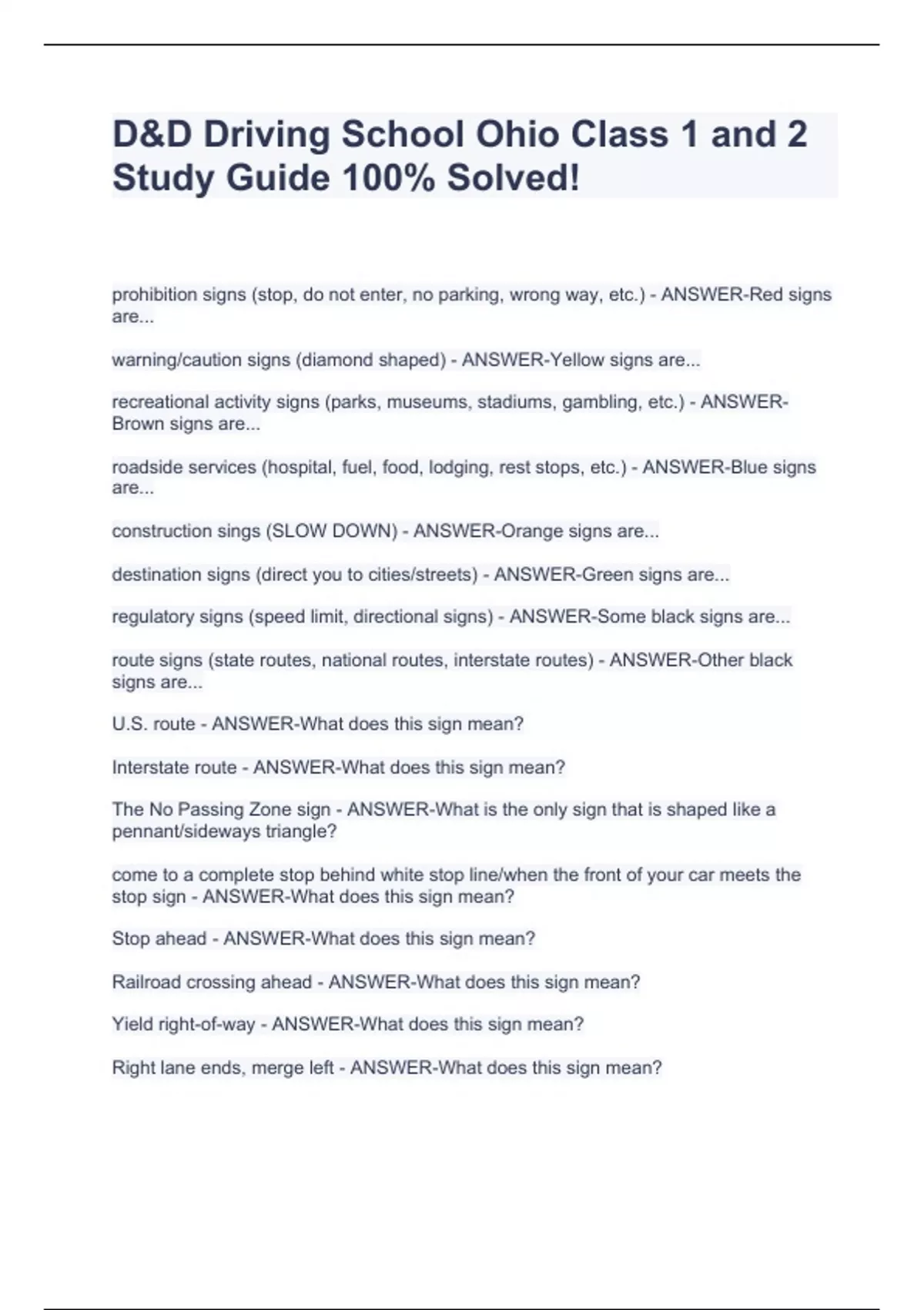 D&D Driving School Ohio Class 1 and 2 Study Guide 100% Solved!