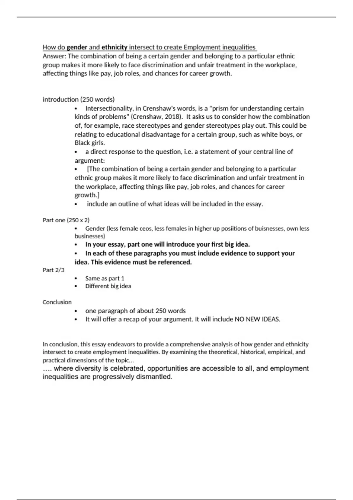 the essay question was: how does gender and ethnicity intersect to create employment inequalities (1500 words) all notes detailed structure given with each paragraphs key points