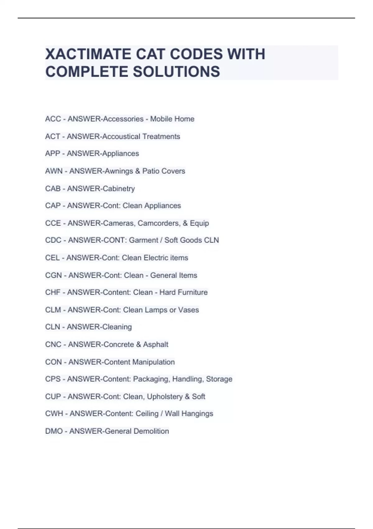 XACTIMATE CAT CODES WITH COMPLETE SOLUTIONS