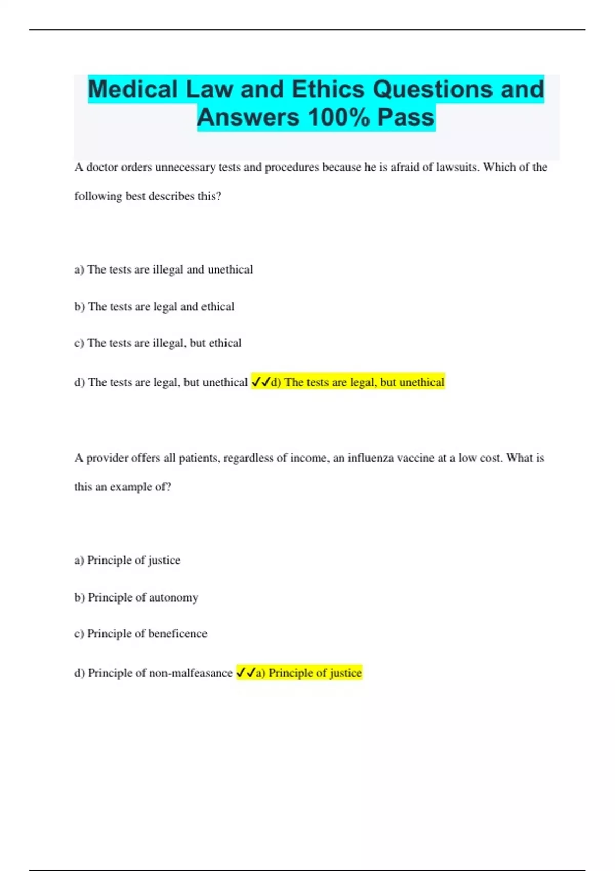 Medical Law and Ethics Questions and Answers 100% Pass A doctor orders unnecessary tests and procedures because he is afraid of lawsuits. Which of the following best describes this? a) The tests are illegal and unethical b) The tests are legal and ethical c) The tests are illegal, but ethical d) The tests are legal, but unethical d) The tests are legal, but unethical A provider offers all patients, regardless of income, an influenza vaccine at a low cost. What is this an example of? a) Principle of justice b) Principle of autonomy c) Principle of beneficence d) Principle of non-malfeasance a) Principle of justice Which of the following is the best example of a legal issue in the medical field? a) Advocating for a patient's wishes against medical orders b) Practicing within the scope of your religious beliefs c) Practicing outside one's licensure/certification d) Expressing personal opinions about end-of-life care c) Practicing outside one's licensure/certification A concert pianist is injured in an accident. One of her arms is so badly injured that it should be amputated, but the pianist doesn't want to lose one of her hands. What is this an example of? a) Ladder of responsibility b) Medical dilemma c) Medical morals d) Clinical model b) Medical dilemma Ethics must be grounded in a) Sincerity b) Reason and fact c) Emotion d) Religious belief b) Reason and fact Which of the following is a common legal issue in the medical field? a) Violation of confidentiality b) Medication errors c) Negligence causing harm d) All of the above d) All of the above An example of the principle of autonomy is a) A physician explains the benefits of an elective hysterectomy to a patient because the patient is afraid. b) A physician explains all of the risks and benefits of an elective hysterectomy to a patient prior to her surgery. c) A physician decides not to tell an elderly patient that he has a diagnosis of cancer because the family requested that the patient not be told. d) A physician decides to discuss an elderly patient's diagnosis with his family first so they can decide if the patient should also be told. b) A physician explains all of the risks and benefits of an elective hysterectomy to a patient prior to her