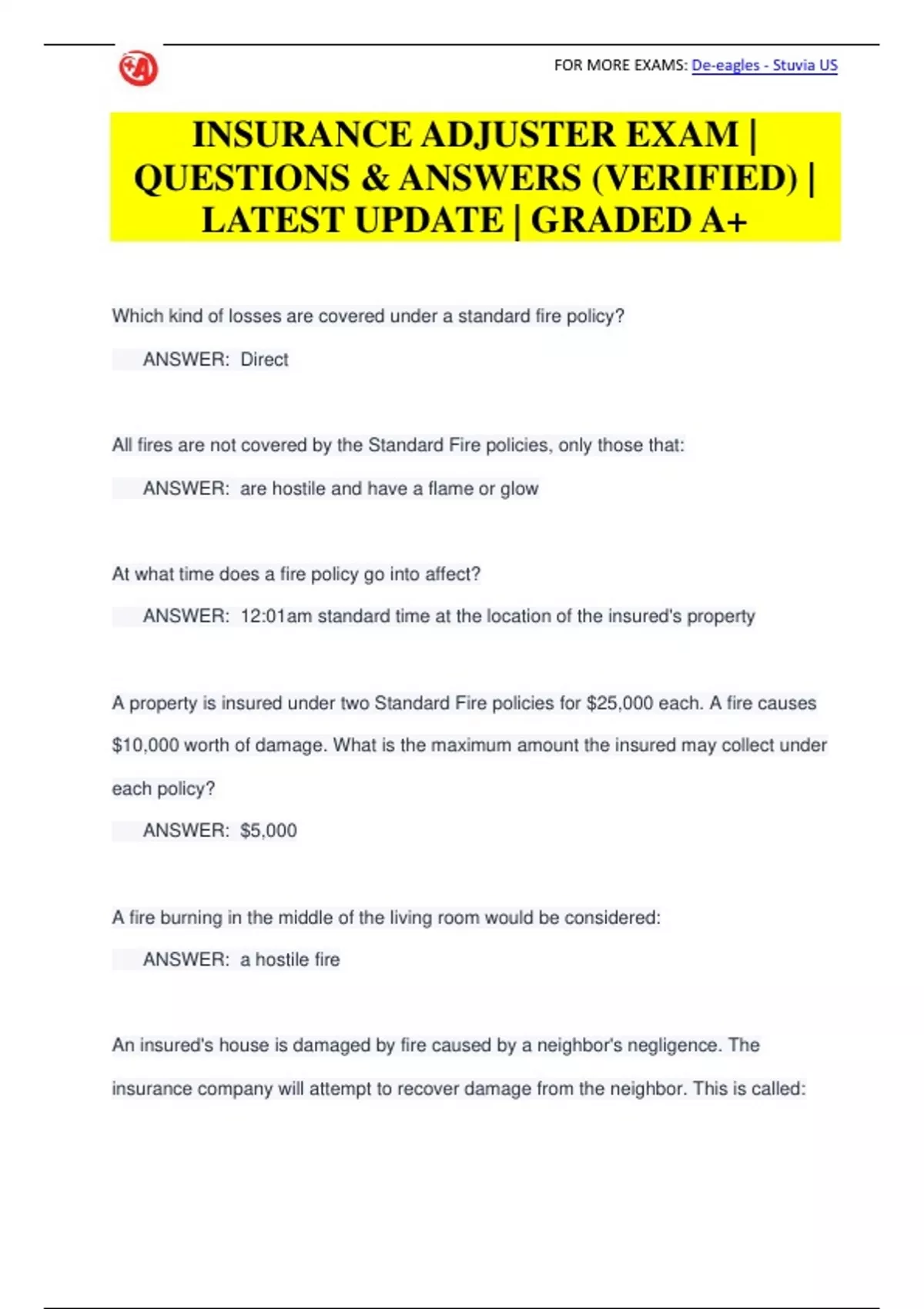 INSURANCE ADJUSTER EXAM | QUESTIONS & ANSWERS (VERIFIED) | LATEST UPDATE | GRADED A+