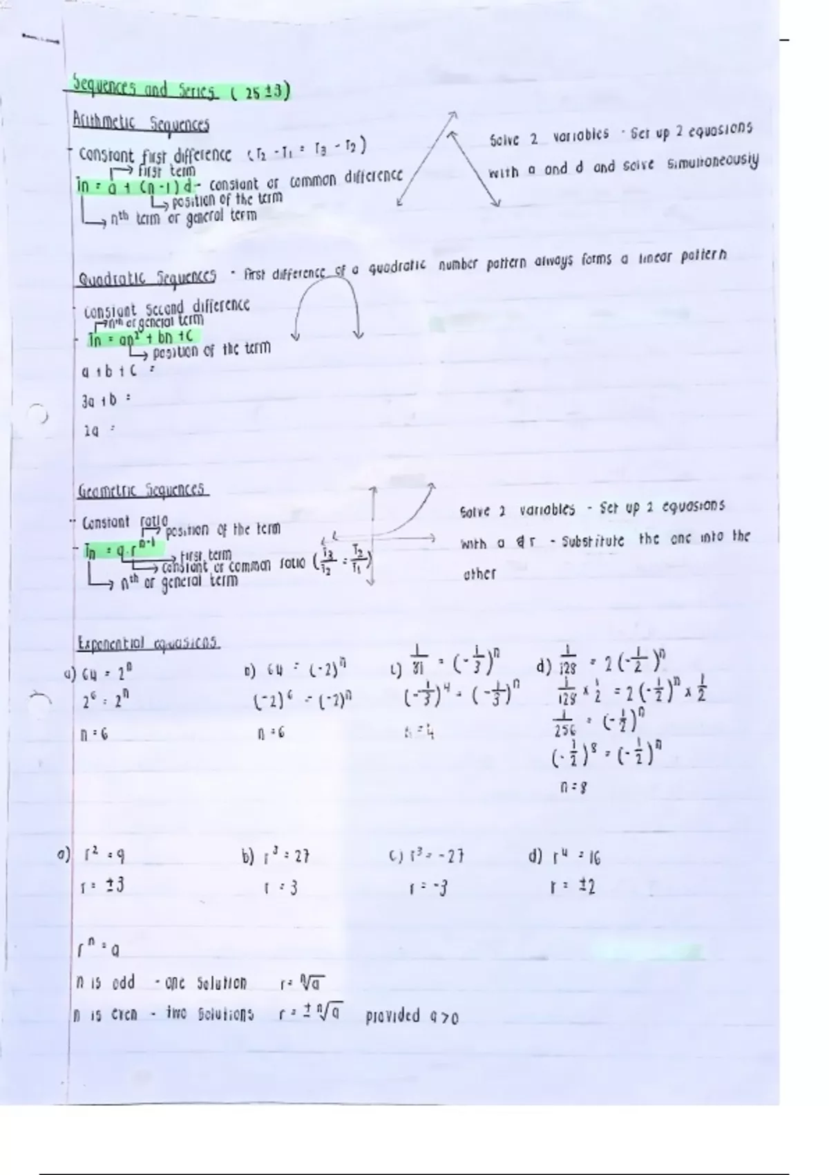 The document includes notes on arithmetic, quadratic and geometric sequences