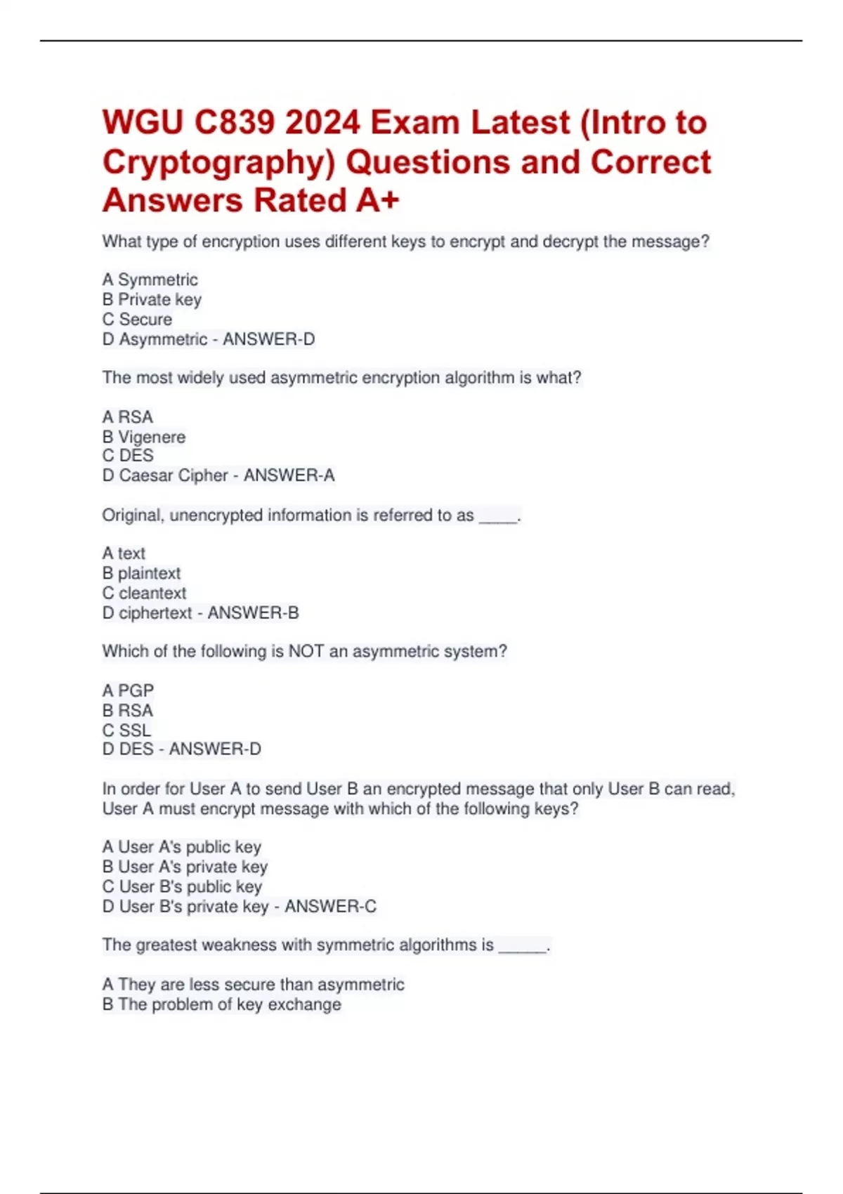 WGU C839 2024 Exam Latest (Intro to Cryptography) Questions and Correct Answers Rated A+
