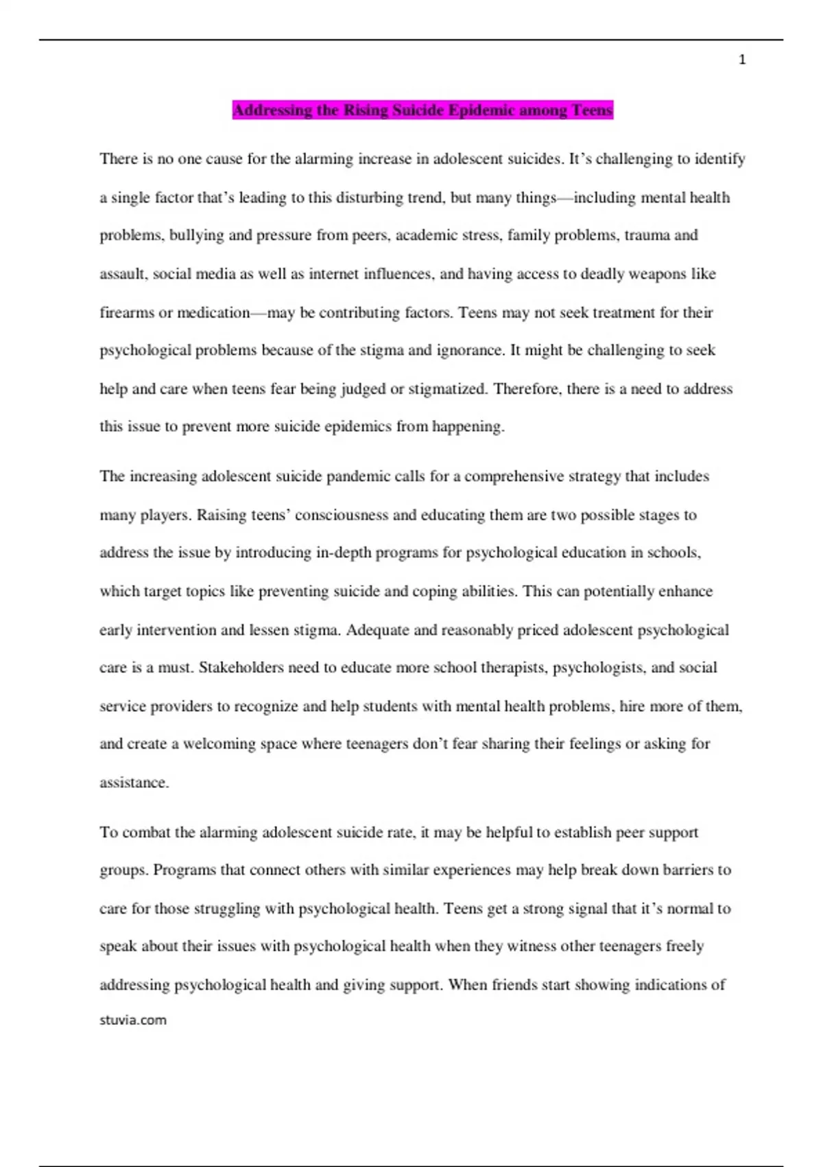Summary Addressing the Rising Suicide Epidemic among Teens