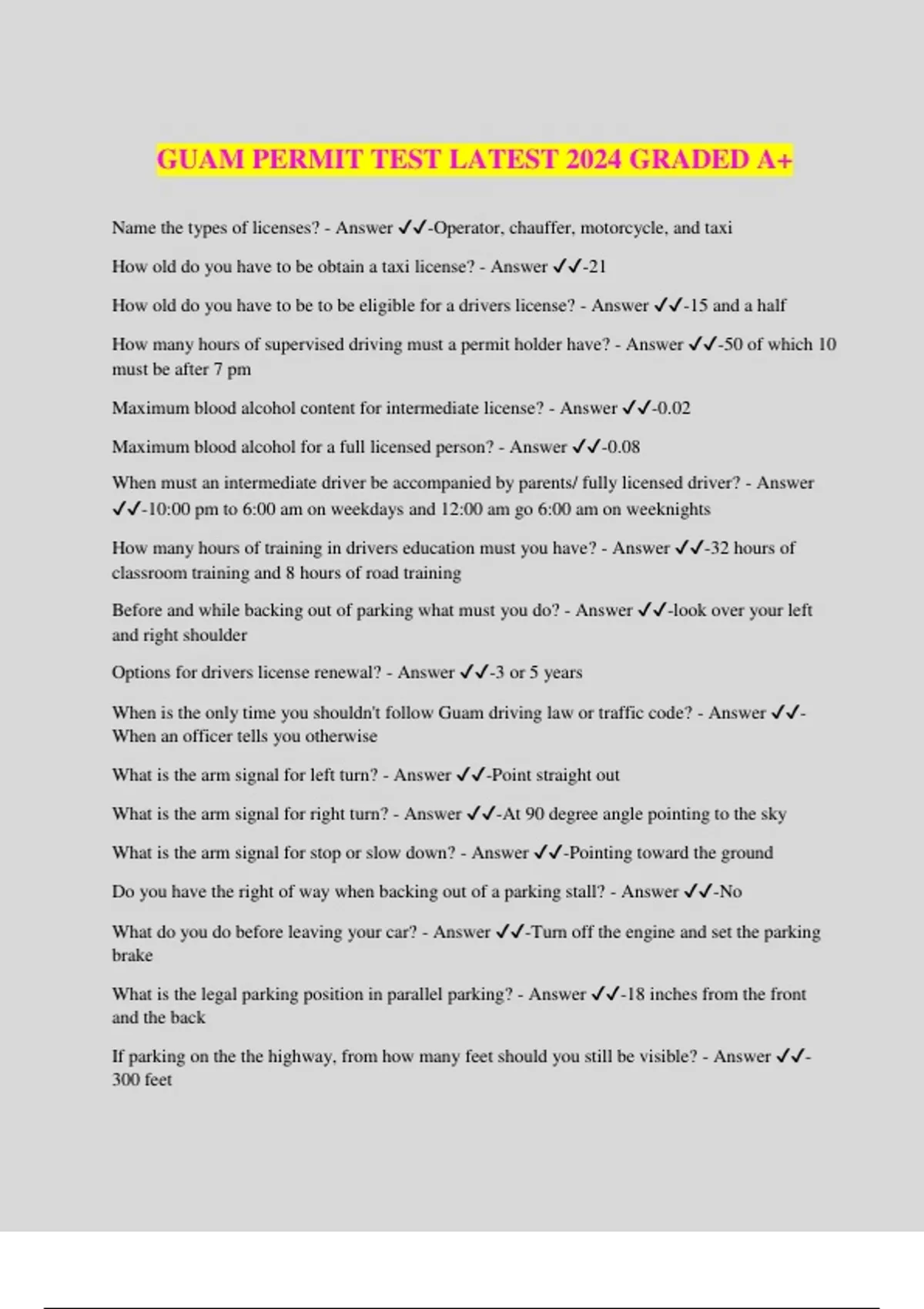GUAM PERMIT TEST LATEST 2024 GRADED A+ Name the types of licenses? - Answer ️️ -Operator, chauffer, motorcycle, and taxi How old do you have to be obtain a taxi license? - Answer ️️ -21 How old do you have to be to be eligible for a drivers license? - Answer ️️ -15 and a half How many hours of supervised driving must a permit holder have? - Answer ️️ -50 of which 10 must be after 7 pm Maximum blood alcohol content for intermediate license? - Answer ️️ -0.02 Maximum blood alcohol for a full licensed person? - Answer ️️ -0.08 When must an intermediate driver be accompanied by parents/ fully licensed driver? - Answer ️️ -10:00 pm to 6:00 am on weekdays and 12:00 am go 6:00 am on weeknights How many hours of training in drivers education must you have? - Answer ️️ -32 hours of classroom training and 8 hours of road training Before and while backing out of parking what must you do? - Answer ️️ -look over your left and right shoulder Options for drivers license renewal? - Answer ️️ -3 or 5 years When is the only time you shouldn't follow Guam driving law or traffic code? - Answer ️️ - When an officer tells you otherwise What is the arm signal for left turn? - Answer ️️ -Point straight out What is the arm signal for right turn? - Answer ️️ -At 90 degree angle pointing to the sky What is the arm signal for stop or slow down? - Answer ️️ -Pointing toward the ground Do you have the right of way when backing out of a parking stall? - Answer ️️ -No What do you do before leaving your car? - Answer ️️ -Turn off the engine and set the parking brake What is the legal parking position in parallel parking? - Answer ️️ -18 inches from the front and the back If parking on the the highway, from how many feet should you still be visible? - Answer ️️ - 300 feet