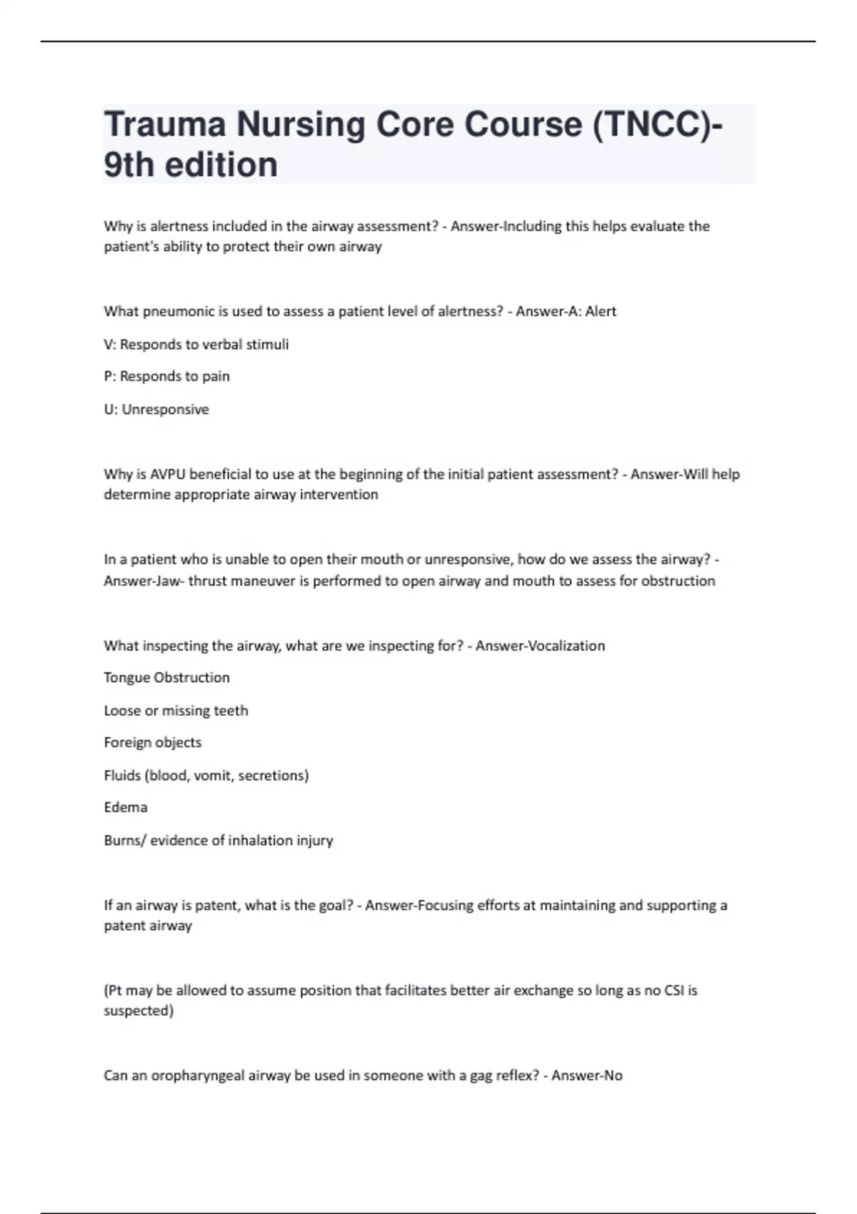 Trauma Nursing Core Course (TNCC)- 9th edition Exam Questions with Correct Answers