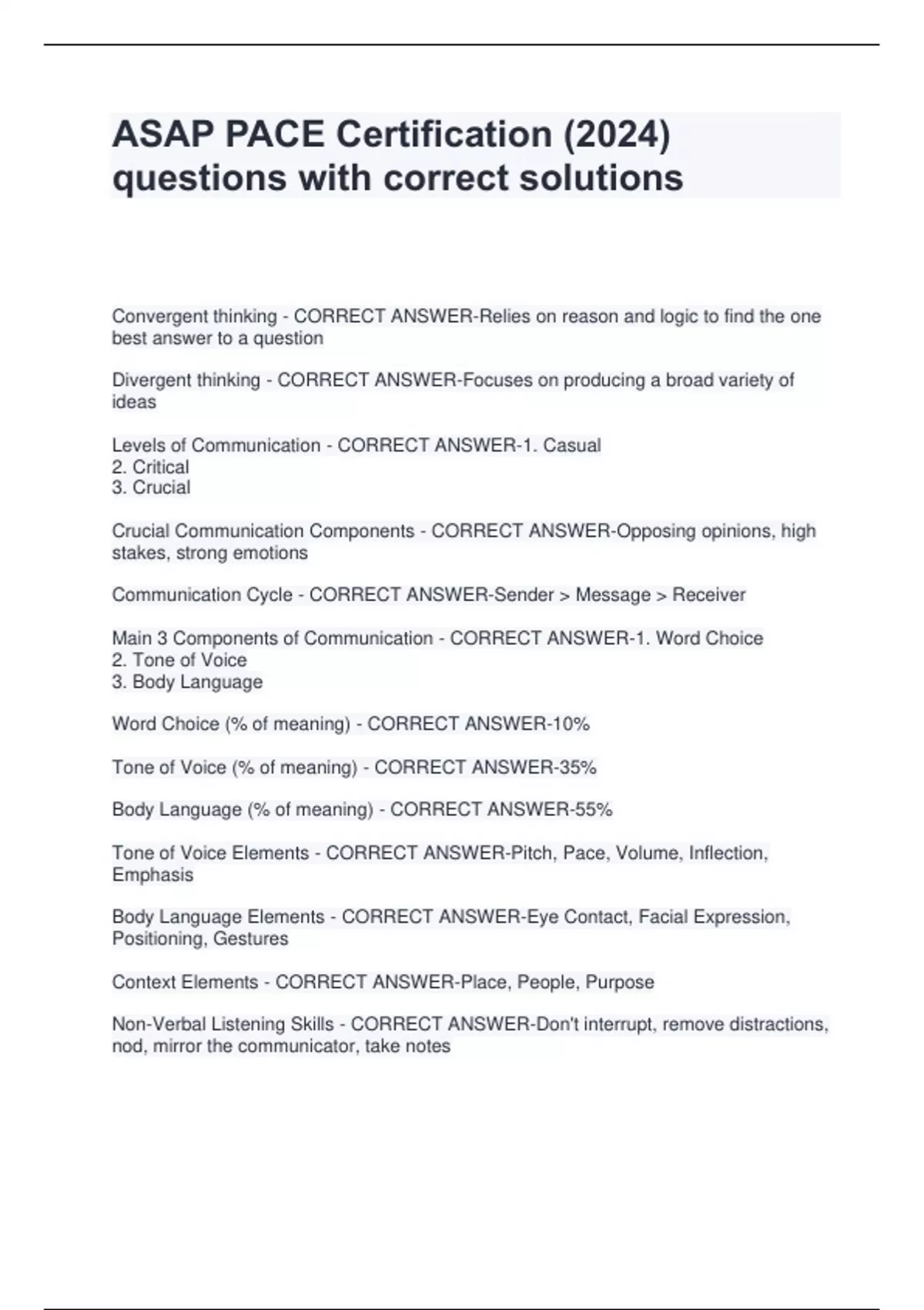 ASAP PACE Certification (2024) questions with correct solutions Convergent thinking - CORRECT ANSWER-Relies on reason and logic to find the one best answer to a question Divergent thinking - CORRECT ANSWER-Focuses on producing a broad variety of ideas Levels of Communication - CORRECT ANSWER-1. Casual 2. Critical 3. Crucial Crucial Communication Components - CORRECT ANSWER-Opposing opinions, high stakes, strong emotions Communication Cycle - CORRECT ANSWER-Sender > Message > Receiver Main 3 Components of Communication - CORRECT ANSWER-1. Word Choice 2. Tone of Voice 3. Body Language Word Choice (% of meaning) - CORRECT ANSWER-10% Tone of Voice (% of meaning) - CORRECT ANSWER-35% Body Language (% of meaning) - CORRECT ANSWER-55% Tone of Voice Elements - CORRECT ANSWER-Pitch, Pace, Volume, Inflection, Emphasis Body Language Elements - CORRECT ANSWER-Eye Contact, Facial Expression, Positioning, Gestures Context Elements - CORRECT ANSWER-Place, People, Purpose Non-Verbal Listening Skills - CORRECT ANSWER-Don't interrupt, remove distractions, nod, mirror the communicator, take notes Verbal Listening Skills - CORRECT ANSWER-Probe, clarify, paraphrase, reflect, encourage 4 Communication Styles - CORRECT ANSWER-1. The Director 2. The Socializer 3. The Thinker 4. The Relator Elements of Emotional Intelligence (EQ) - CORRECT ANSWER-Personal Competence, Social Competence Personal Competence (EQ) Elements - CORRECT ANSWER-Self-Awareness, SelfManagement Social Competence (EQ) Elements - CORRECT ANSWER-Social Awareness, Relationship Management Self-Awareness (EQ) - CORRECT ANSWER-Understand your own emotions Self-Management (EQ) - CORRECT ANSWER-Managing your own emotions and behaviors Social Awareness (EQ) - CORRECT ANSWER-Identify and understand the emotions of others Relationship Management (EQ) - CORRECT ANSWER-Manage interactions with others successfully Prescriptive Feedback - CORRECT ANSWER-Offer a solution for the problem - what they can do different next time Descriptive Feedback - CORRECT ANSWER-State what didn't work and why - no judgement, stick to the facts Receiving Positive Feedback - CORRECT ANSWER-Accept it, show gratitude, make note Receiving Negative Feedback - CORRECT ANSWER-Listen, clarify, manage emotions Constructive Conflict - CORRECT ANSWER-Can lead to better decisions, more creative problem solving and stronger relationships Destructive Conflict - CORRECT ANSWER-Creates negative outcomes - broken relationships, decreased productivity and harms reputations
