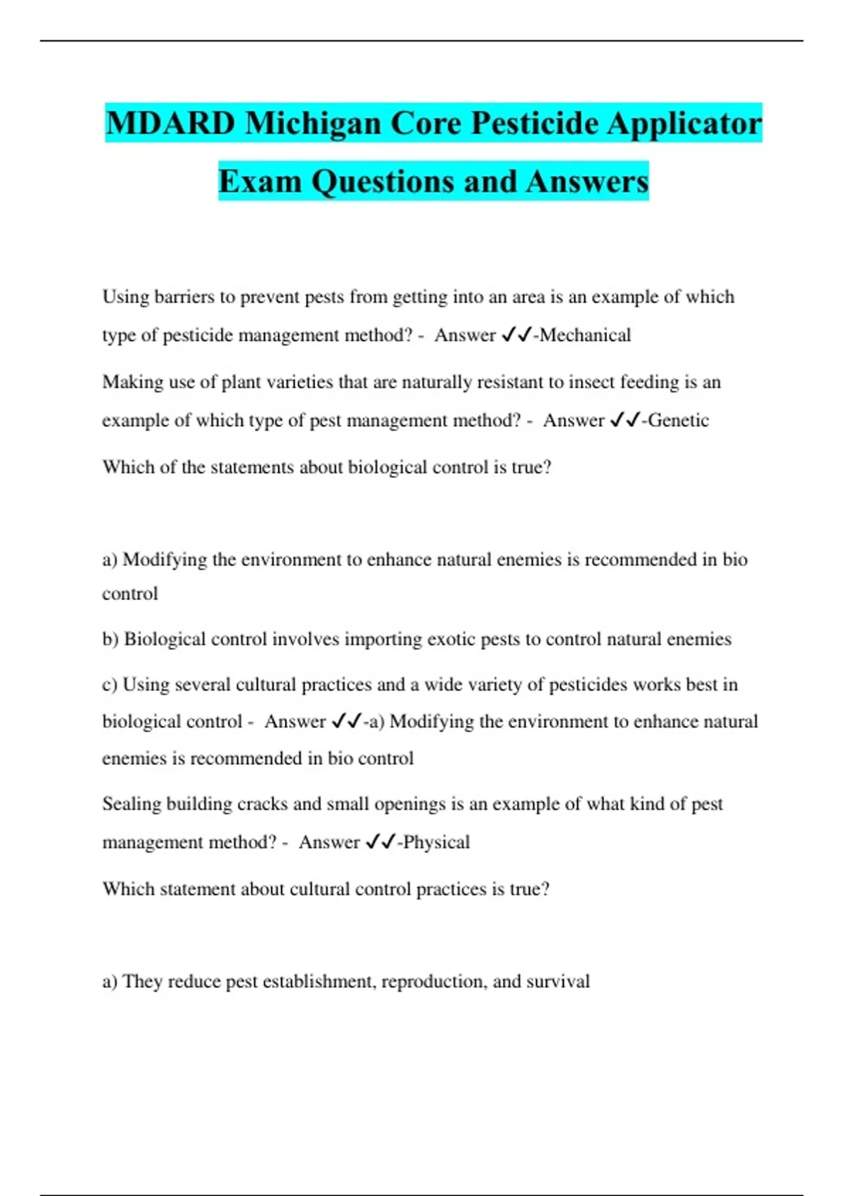 MDARD Michigan Core Pesticide Applicator Exam Questions and Answers
