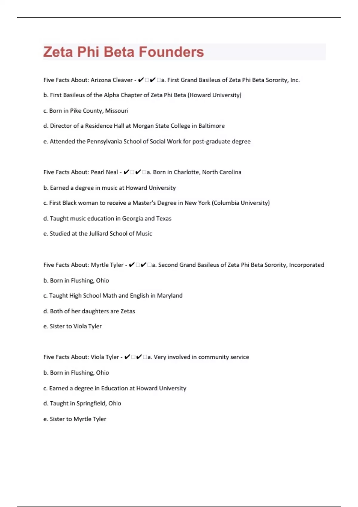 Five Facts About: Arizona Cleaver - ️️a. First Grand Basileus of Zeta Phi Beta Sorority, Inc. b. First Basileus of the Alpha Chapter of Zeta Phi Beta (Howard University) c. Born in Pike County, Missouri d. Director of a Residence Hall at Morgan State College in Baltimore e. Attended the Pennsylvania School of Social Work for post-graduate degree Five Facts About: Pearl Neal - ️️a. Born in Charlotte, North Carolina b. Earned a degree in music at Howard University c. First Black woman to receive a Master's Degree in New York (Columbia University) d. Taught music education in Georgia and Texas e. Studied at the Julliard School of Music Five Facts About: Myrtle Tyler - ️️a. Second Grand Basileus of Zeta Phi Beta Sorority, Incorporated b. Born in Flushing, Ohio c. Taught High School Math and English in Maryland d. Both of her daughters are Zetas e. Sister to Viola Tyler Five Facts About: Viola Tyler - ️️a. Very involved in community service b. Born in Flushing, Ohio c. Earned a degree in Education at Howard University d. Taught in Springfield, Ohio e. Sister to Myrtle Tyler