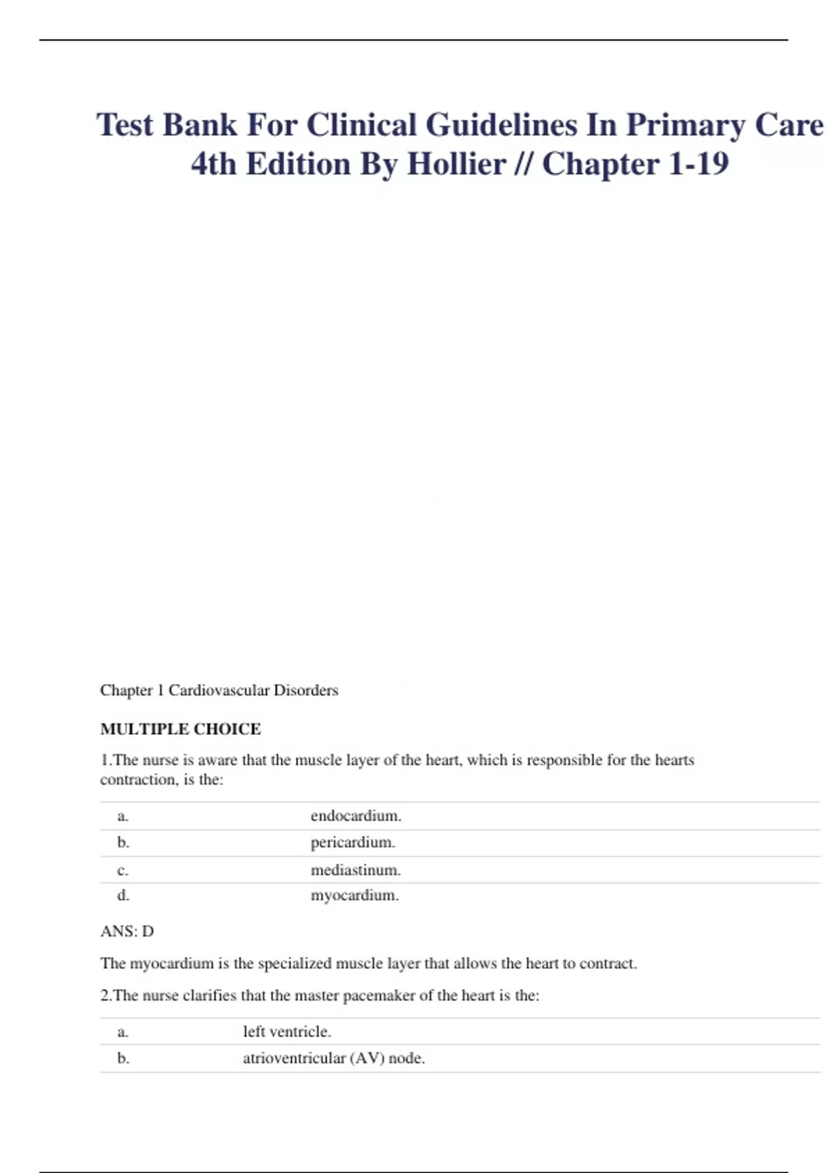 Test Bank For Clinical Guidelines In Primary Care 4th Edition By Hollier // Chapter 1-19 Chapter 1 Cardiovascular Disorders MULTIPLE CHOICE 1.The nurse is aware that the muscle layer of the heart, which is responsible for the hearts contraction, is the: a. endocardium. b. pericardium. c. mediastinum. d. myocardium. ANS: D The myocardium is the specialized muscle layer that allows the heart to contract. 2.The nurse clarifies that the master pacemaker of the heart is the: a. left ventricle. b. atrioventricular (AV) node. c. sinoatrial (SA) node. d. bundle of His. ANS: C The SA node is the master pacemaker of the heart. 3.The nurse is aware that the symptoms of an impending myocardial infarction (MI) differ in women because acute chest pain is not present. Women are frequently misdiagnosed as having: a. hepatitis A. b. indigestion. c. urinary infection. d. menopausal complications. ANS: B Indigestion, gallbladder attack, anxiety attack, and depression are frequent misdiagnoses for women having an MI. 4.The nurse identifies the LUBB sound of the LUBB/DUBB of the cardiac cycle as the sound of the: a. AV valves closing. b. closure of the semilunar valves. c. contraction of the papillary muscles. d. contraction of the ventricles. ANS: A The LUBB is the first sound of a low pitch heard when the AV valves close. 5.A patient is admitted from the emergency department. The emergency department physician notes the patient has a diagnosis of heart failure with a New York Heart Association (NYHA) classification of IV. This indicates the patients condition as: a. moderate heart failure. b. severe heart failure. c. congestive heart failure. d. negligible heart failure. ANS: B Class IV: Severe; patient unable to perform any physical activity without discomfort. Angina or symptoms of cardiac inefficiency may develop at rest. 6.The nurse assesses that the home health patient has no signs or symptoms of heart failure, but does have a history of rheumatic fever and has been recently diagnosed with diabetes mellitus. The nurse is aware that using the American College of Cardiology and the American Heart Association (ACC/AHA) staging, this patient would be a: a. stage A. b. stage B. c. stage C. d. stage D. ANS: A The ACC/AHA staging describes stage A as a person without symptoms of heart failure, but with primary conditions associated with the development of the disease. 7.The nurse caring for a patient recovering from a myocardial infarct who is on remote telemetry recognizes the need for added instruction when the patient says: a. I can ambulate in the hallway with this gadget on. b. I always take off the telemetry device when I shower. c. My EKG is being watched by one of the nurses in CCU on the home unit. d. I am able to sleep just fine with this device on. ANS: B Remote telemetry allows the patient to be on a separate unit, but be monitored in a central location. The patients can be ambulatory and can sleep with the monitor on. They should not remove the monitor to shower. 8.The nurse assesses pitting edema that can be depressed approximately inch and refills in 15 seconds. The nurse would document this assessment as: a. +1 edema. b. +2 edema. c. +3 edema. d. +4 edema. ANS: B A +2 edema can be documented if the skin can be depressed inch and respond within 15 seconds. 9.What do dark or cold spots on a thallium scan indicate? a. Tissue with adequate blood supply b. Dilated vessels c. Areas of neoplastic growth d. Tissue that has inadequate perfusion ANS: D Thallium scans show adequate perfused areas by the collection of thallium. Dark spots or cold spots indicate tissues that have inadequate perfusion. 10.The nurse recognizes the echocardiogram report that shows an ejection factor of 42% as an indication of: a. normal heart action. b. mild heart failure. c. moderate heart failure. d. severe heart failure. ANS: C An ejection factor (cardiac output) of 42% indicates moderate heart failure. 11.The nurse takes into consideration that age-related changes can affect the peripheral circulation because of: a. sclerosed blood vessels. b. hypotension. c. inactivity. d. poor nutrition. ANS: A Aging causes sclerotic changes in the blood vessels that lead to decreased elasticity and narrowing of the vessel lumen. 12.The nurse assessing a cardiac monitor notes that the cardiac complexes each have a P wave followed by a QRS and a T. The rate is 120. The nurse recognizes this arrhythmia as: a. sinus bradycardia. b. atrial fibrillation. c. sinus tachycardia. d. ventricular tachycardia. ANS: C Sinus tachycardia has a P wave followed by the QRS and the T. All the components of the complex are present and in the correct order, but the rate is over 100 beats a minute. 13.After an influenza-like illness, the patient complains of chills and small petechiae in his mouth and his legs. A heart murmur is detectable. These are characteristic signs of: a. congestive heart failure. b. heart block. c. aortic stenosis. d. infective endocarditis. ANS: D Collection of subjective data includes noting patient complaints of influenza-like symptoms with recurrent fever, undue fatigue, chest pain, and chills. Objective data may reveal the significant