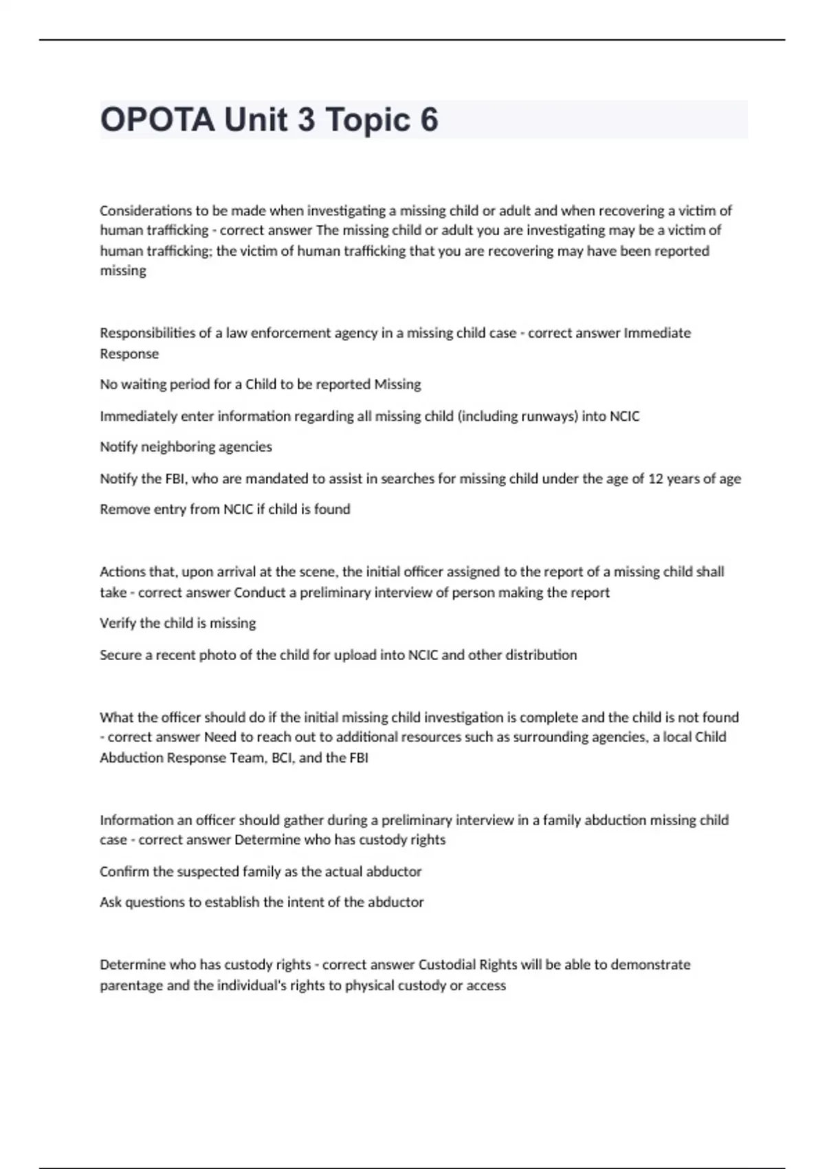 OPOTA Unit 3 Topic 6Considerations to be made when investigating a missing child or adult and when recovering a victim of human trafficking - correct answer The missing child or adult you are investigating may be a victim of human trafficking; the victim of human trafficking that you are recovering may have been reported missing Responsibilities of a law enforcement agency in a missing child case - correct answer Immediate Response No waiting period for a Child to be reported Missing Immediately enter information regarding all missing child (including runways) into NCIC Notify neighboring agencies Notify the FBI, who are mandated to assist in searches for missing child under the age of 12 years of age Remove entry from NCIC if child is found Actions that, upon arrival at the scene, the initial officer assigned to the report of a missing child shall take - correct answer Conduct a preliminary interview of person making the report Verify the child is missing Secure a recent photo of the child for upload into NCIC and other distribution What the officer should do if the initial missing child investigation is complete and the child is not found - correct answer Need to reach out to additional resources such as surrounding agencies, a local Child Abduction Response Team, BCI, and the FBI Information an officer should gather during a preliminary interview in a family abduction missing child case - correct answer Determine who has custody rights Confirm the suspected family as the actual abductor Ask questions to establish the intent of the abductor Determine who has custody rights - correct answer Custodial Rights will be able to demonstrate parentage and the individual's rights to physical custody or access