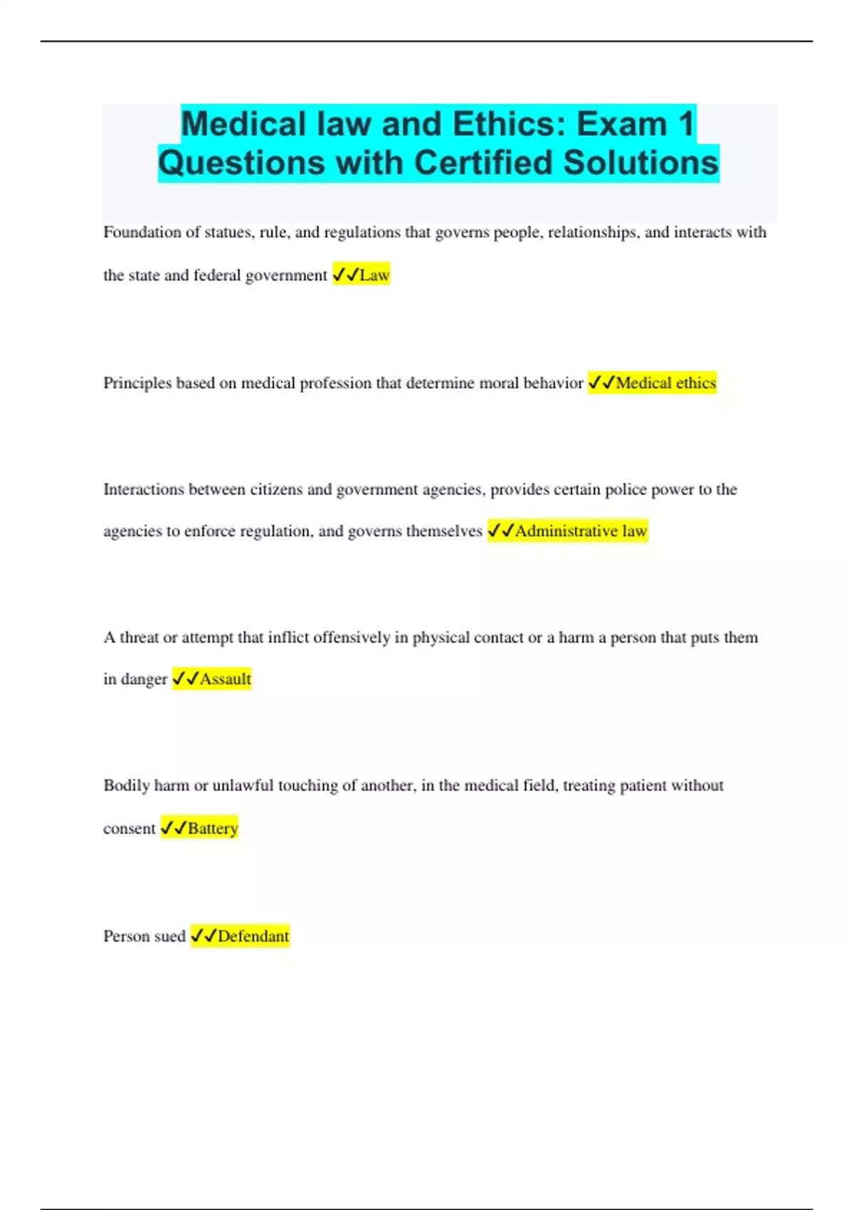 Medical law and Ethics: Exam 1 Questions with Certified Solutions