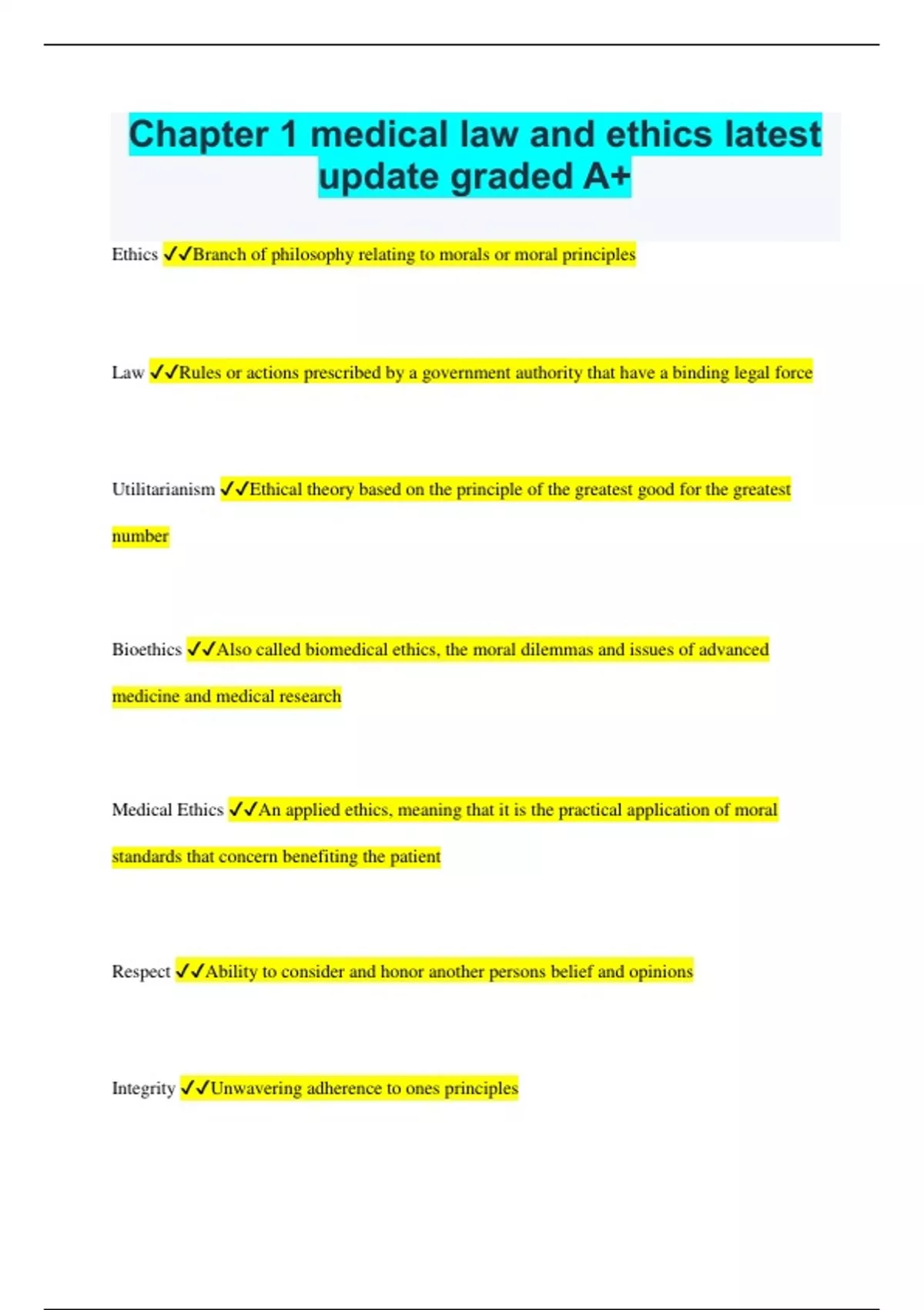 Chapter 1 medical law and ethics latest update graded A+ Ethics Branch of philosophy relating to morals or moral principles Law Rules or actions prescribed by a government authority that have a binding legal force Utilitarianism Ethical theory based on the principle of the greatest good for the greatest number Bioethics Also called biomedical ethics, the moral dilemmas and issues of advanced medicine and medical research Medical Ethics An applied ethics, meaning that it is the practical application of moral standards that concern benefiting the patient Respect Ability to consider and honor another persons belief and opinions Integrity Unwavering adherence to ones principles Honesty Quality of truthfulness Fairness Treating everyone the same Empathy Ability to understand the feelings of others without actually experiencing their pain or distress Sympathy Feeling sorry or pity for someone Compassion To have a gentle, caring attitude toward patients and fellow employees Loyalty Sense if faithfulness or commitment to a person or persons Privacy Ability to safeguard another persons confidences or information Sexual Harassment Unwelcome sexual advances/request equal employment opportunity commission Due process Entitlement of employees of the government and public companies to have certain procedures followed when they believe their rights are in jeopardy Comparable Worth A.K.A pay equity, theory that extends equal pay requirements to all persons who are doing equal work Litigious Society in which people have become excessively inclined to sue healthcare practitioners Medical Practice Acts The way medicine is practiced in a particular state Precedent The decision in the case acts as a model for future cases in which the facts are the same Cost/Benefit Analysis Justifies the means of achieving a goal Rights-Based Ethics Places the primary emphasis on a persons individual rights....based in justice, states that the rights belong to all people purely by virtue of their being human Duty-Based Ethics Focuses on performing one's duty to various people and institutions such as parents,employers,and customers(patients) Virtue- Based Ethics Emphasis on persons and not necessarily on the decisions or principles that are involved Beneficence Action of helping others and performing actions that would result in to benefit another person Fidelity Loyalty and faithfulness to others Gentleness Mild, tender hearted approach to other people Humility Acquiring an unpretentious and humble manner Justice Fairness in all our actions with other people Perseverance Persisting with a task or idea even against obstacles Sanctity of life Sacredness of human life Tolerance Respect for this whose opinions, practices, race, religion, and nationality differ from our own Principle of Autonomy People have the right to make decisions about their own life Principle of Beneficence Principle of doing good, means that we must not harm patients while we are trying to help them Principle of Nonmaleficence Taken from the Latin maxim PRIUMUM NON NOCERE which means "First, do no harm" Quality of Assurance Gathering and evaluating information about the services provided as well as the results achieved