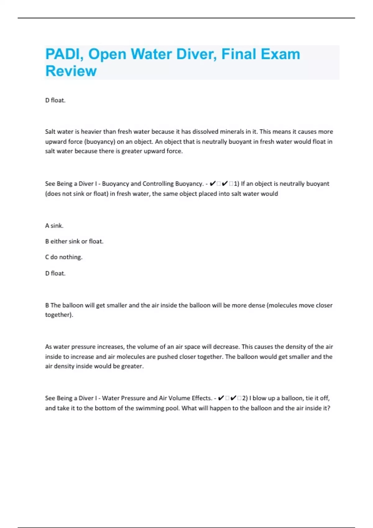 PADI, Open Water Diver, 56 Final Exam Review Questions And Answers