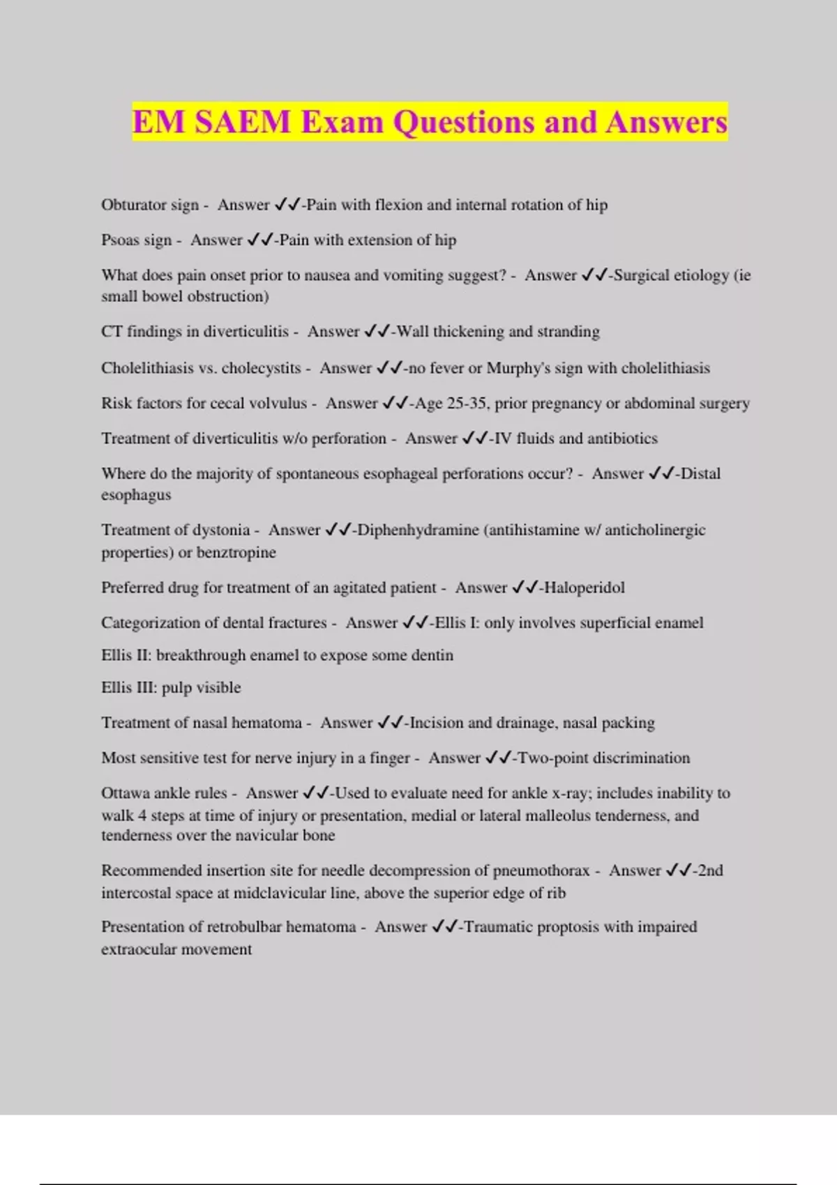EM SAEM Exam Questions and Answers Obturator sign - Answer ️️ -Pain with flexion and internal rotation of hip Psoas sign - Answer ️️ -Pain with extension of hip What does pain onset prior to nausea and vomiting suggest? - Answer ️️ -Surgical etiology (ie small bowel obstruction) CT findings in diverticulitis - Answer ️️ -Wall thickening and stranding Cholelithiasis vs. cholecystits - Answer ️️ -no fever or Murphy's sign with cholelithiasis Risk factors for cecal volvulus - Answer ️️ -Age 25-35, prior pregnancy or abdominal surgery Treatment of diverticulitis w/o perforation - Answer ️️ -IV fluids and antibiotics Where do the majority of spontaneous esophageal perforations occur? - Answer ️️ -Distal esophagus Treatment of dystonia - Answer ️️ -Diphenhydramine (antihistamine w/ anticholinergic properties) or benztropine Preferred drug for treatment of an agitated patient - Answer ️️ -Haloperidol Categorization of dental fractures - Answer ️️ -Ellis I: only involves superficial enamel Ellis II: breakthrough enamel to expose some dentin Ellis III: pulp visible Treatment of nasal hematoma - Answer ️️ -Incision and drainage, nasal packing Most sensitive test for nerve injury in a finger - Answer ️️ -Two-point discrimination Ottawa ankle rules - Answer ️️ -Used to evaluate need for ankle x-ray; includes inability to walk 4 steps at time of injury or presentation, medial or lateral malleolus tenderness, and tenderness over the navicular bone Recommended insertion site for needle decompression of pneumothorax - Answer ️️ -2nd intercostal space at midclavicular line, above the superior edge of rib Presentation of retrobulbar hematoma - Answer ️️ -Traumatic proptosis with impaired extraocular movement Subconjunctival hemorrhage vs. hyphema - Answer ️️ -1. Subconjunctival hemorrhage: painless, does not cross the limbus 2. Hyphema: painful bleeding in the anterior chamber Test of choice for solid organ injury - Answer ️️ -CT Is a transverse process fracture stable or unstable? - Answer ️️ -Stable Diagnosis of urological injury - Answer ️️ -CT pelvis plus IV and transurethral contrast Features most indicative of success with ED thoracotomy - Answer ️️ -Patient with penetrating chest wounds who is unconscious and pulseless but has a detectable BP Immediate risk with knee dislocation - Answer ️️ -Damage to popliteal