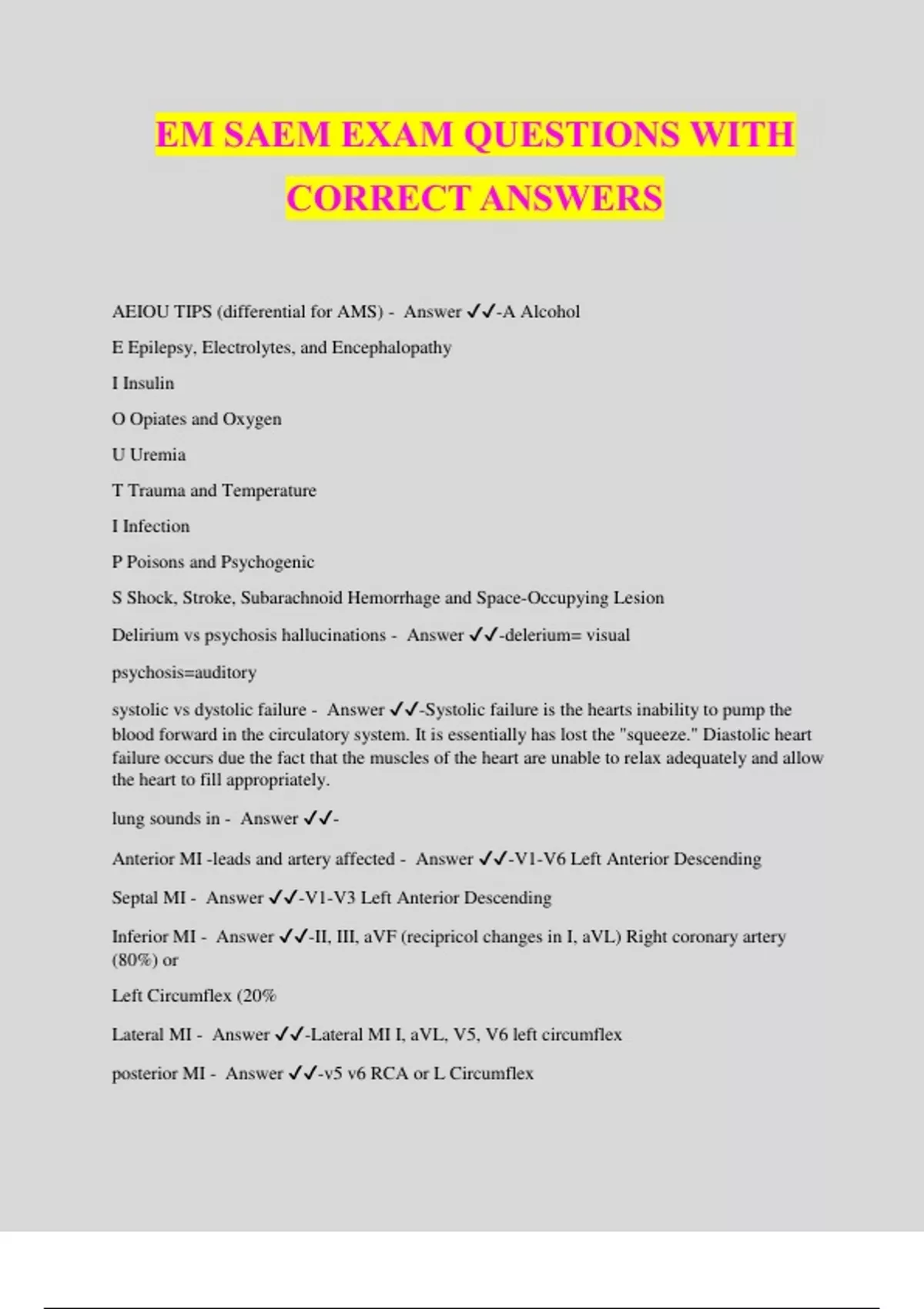 EM SAEM EXAM QUESTIONS WITH CORRECT ANSWERS AEIOU TIPS (differential for AMS) - Answer ️️ -A Alcohol E Epilepsy, Electrolytes, and Encephalopathy I Insulin O Opiates and Oxygen U Uremia T Trauma and Temperature I Infection P Poisons and Psychogenic S Shock, Stroke, Subarachnoid Hemorrhage and Space-Occupying Lesion Delirium vs psychosis hallucinations - Answer ️️ -delerium= visual psychosis=auditory systolic vs dystolic failure - Answer ️️ -Systolic failure is the hearts inability to pump the blood forward in the circulatory system. It is essentially has lost the "squeeze." Diastolic heart failure occurs due the fact that the muscles of the heart are unable to relax adequately and allow the heart to fill appropriately. lung sounds in - Answer ️️ - Anterior MI -leads and artery affected - Answer ️️ -V1-V6 Left Anterior Descending Septal MI - Answer ️️ -V1-V3 Left Anterior Descending Inferior MI - Answer ️️ -II, III, aVF (recipricol changes in I, aVL) Right coronary artery (80%) or Left Circumflex (20% Lateral MI - Answer ️️ -Lateral MI I, aVL, V5, V6 left circumflex posterior MI - Answer ️️ -v5 v6 RCA or L Circumflex ACS markers (initial, peak, baseline) - Answer ️️ -Myoglobin 1-4 h 6-7 h 18-24 h CK-MB 4-12 h 10-24 h 48-72 h Cardiac Trop I 3-12 h 10-24 h 3-10 d Cardiac Trop T 3-12 h 12-48 h 5-14 d For STEMI what are you looking for on EKG? - Answer ️️ -ST-elevations of 1 mm or more in two contiguous limb lead TIMI Risk Score for Unstable Angina and Non-ST-Elevation MI's (UA/NSTEMI - Answer ️️ - •65 or older? • 3+ CAD risk factors? •Known CAD? •Aspirin use in past week? •Severe angina? •ST segment changes? •Positive cardiac markers blood pressures in arms in aortic dissection - Answer ️️ -measurement of bilateral upper extremity blood pressures with increased concern for thoracic aortic dissection when a systolic BP differential of greater than 20 mmHg between arms is obtained. Blood pressure is typically elevated, especially in patients with type B dissection, though a normal or hypotensive reading may indicate complications of the dissection, such as retroperitoneal hemorrhage or cardiogenic shock from myocardial ischemia or acute aortic insufficiency aortic dissection A vs B presentation - Answer ️️ -Type A dissection is more likely to cause chest pain or syncope and less likely to cause back or abdominal pain when compared to type B dissection. Patients with type B dissection are about two times as likely to present with hypertension (SBP ≥150 mmHg), whereas type A dissections are many times more likely to cause hypotension (SBP aortic dissection pearls - Answer ️️ -· D-dimer is not adequately sensitive for aortic dissection to independently exclude the diagnosis. · Heart rate and blood pressure should be kept as low as possible while maintaining end-organ perfusio