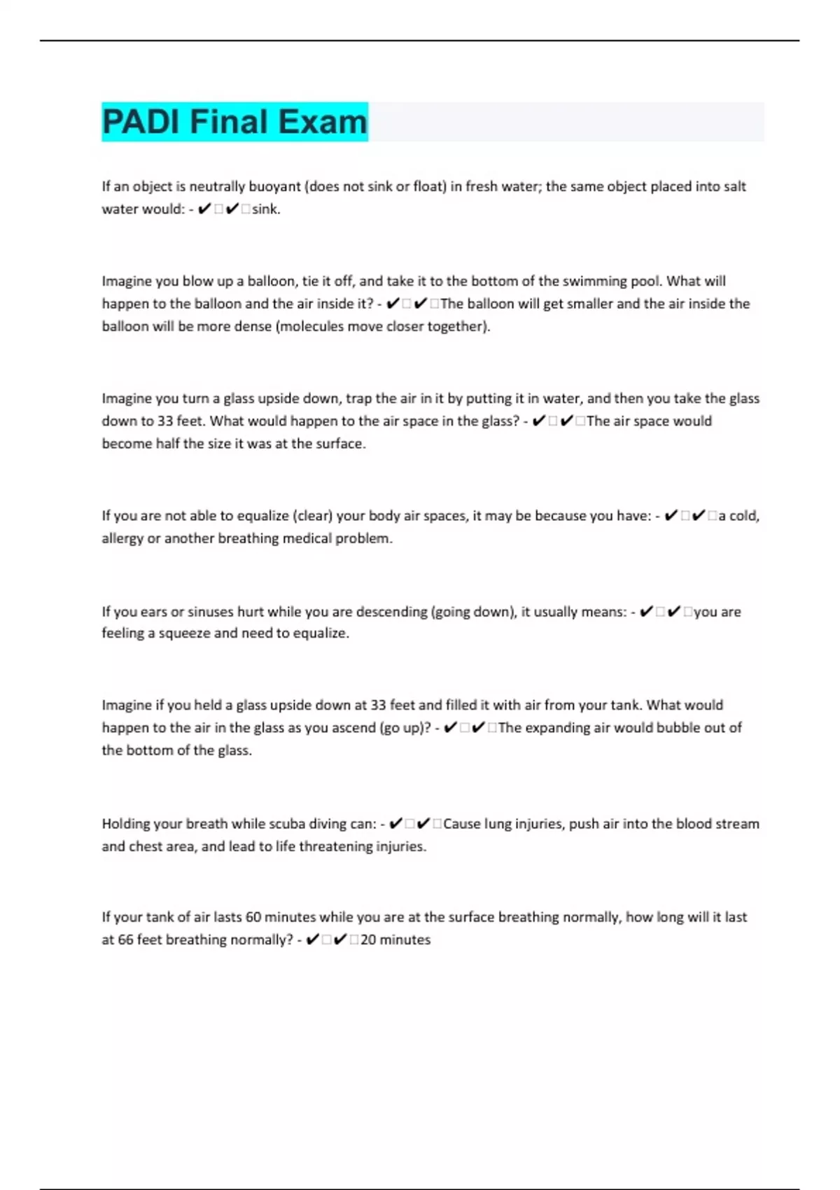 If an object is neutrally buoyant (does not sink or float) in fresh water; the same object placed into salt water would: - ️️sink. Imagine you blow up a balloon, tie it off, and take it to the bottom of the swimming pool. What will happen to the balloon and the air inside it? - ️️The balloon will get smaller and the air inside the balloon will be more dense (molecules move closer together). Imagine you turn a glass upside down, trap the air in it by putting it in water, and then you take the glass down to 33 feet. What would happen to the air space in the glass? - ️️The air space would become half the size it was at the surface. If you are not able to equalize (clear) your body air spaces, it may be because you have: - ️️a cold, allergy or another breathing medical problem. If you ears or sinuses hurt while you are descending (going down), it usually means: - ️️you are feeling a squeeze and need to equalize. Imagine if you held a glass upside down at 33 feet and filled it with air from your tank. What would happen to the air in the glass as you ascend (go up)? - ️️The expanding air would bubble out of the bottom of the glass. Holding your breath while scuba diving can: - ️️Cause lung injuries, push air into the blood stream and chest area, and lead to life threatening injuries. If your tank of air lasts 60 minutes while you are at the surface breathing normally, how long will it last at 66 feet breathing normally? - ️️20 minutes