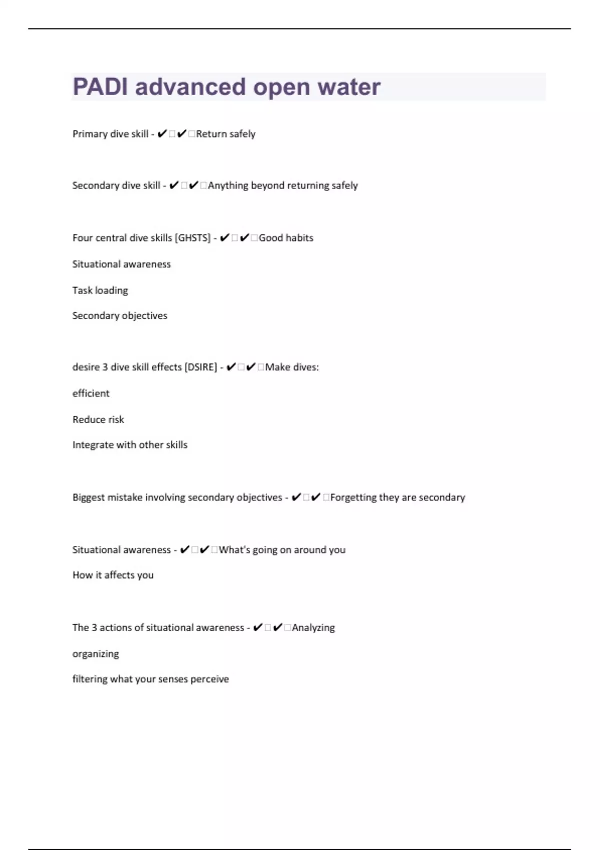 Primary dive skill - ️️Return safely Secondary dive skill - ️️Anything beyond returning safely Four central dive skills [GHSTS] - ️️Good habits Situational awareness Task loading Secondary objectives desire 3 dive skill effects [DSIRE] - ️️Make dives: efficient Reduce risk Integrate with other skills Biggest mistake involving secondary objectives - ️️Forgetting they are secondary Situational awareness - ️️What's going on around you How it affects you The 3 actions of situational awareness - ️️Analyzing organizing filtering what your senses perceive