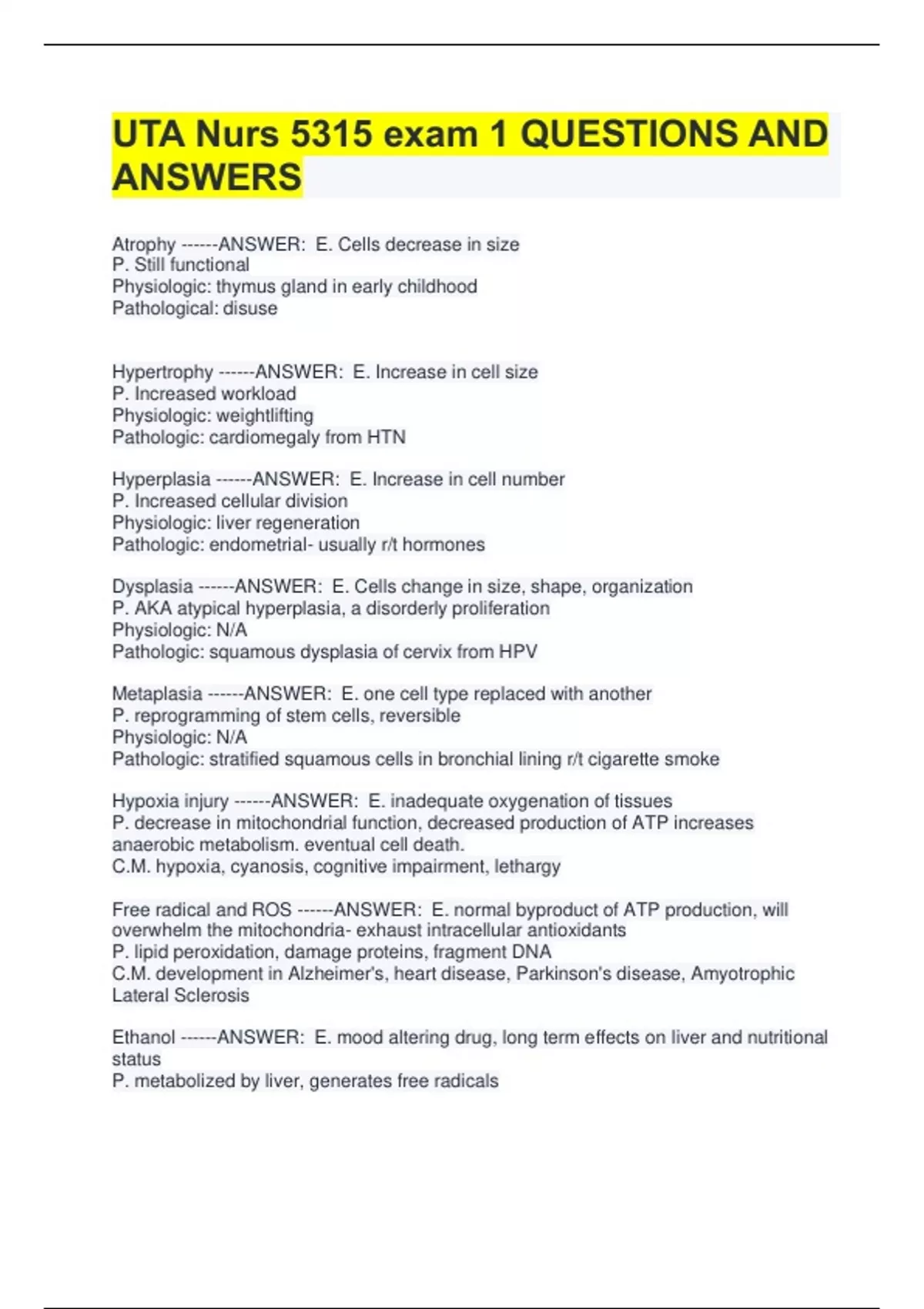 UTA Nurs 5315 exam 1 QUESTIONS AND ANSWERS.Atrophy ------ANSWER: E. Cells decrease in size P. Still functional Physiologic: thymus gland in early childhood Pathological: disuse Hypertrophy ------ANSWER: E. Increase in cell size P. Increased workload Physiologic: weightlifting Pathologic: cardiomegaly from HTN Hyperplasia ------ANSWER: E. Increase in cell number P. Increased cellular division Physiologic: liver regeneration Pathologic: endometrial- usually r/t hormones