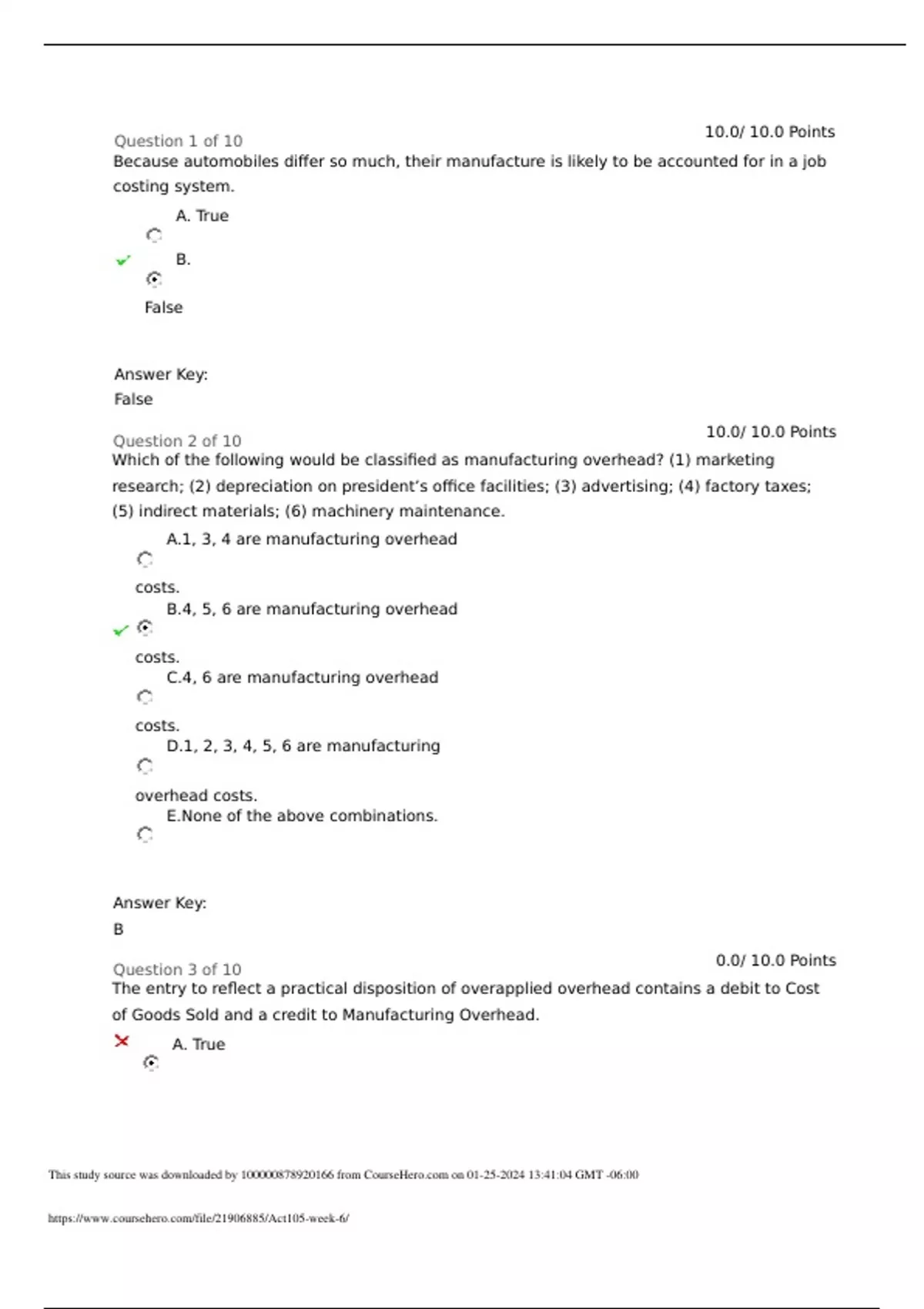 Question 1 of 10 10.0/ 10.0 Points Because automobiles differ so much, their manufacture is likely to be accounted for in a job costing system. A. True B. False Answer Key: False Question 2 of 10 10.0/ 10.0 Points Which of the following would be classified as manufacturing overhead? (1) marketing research; (2) depreciation on president’s office facilities; (3) advertising; (4) factory taxes; (5) indirect materials; (6) machinery maintenance. A.1, 3, 4 are manufacturing overhead costs. B.4, 5, 6 are manufacturing overhead costs. C.4, 6 are manufacturing overhead costs. D.1, 2, 3, 4, 5, 6 are manufacturing overhead costs. E.None of the above com