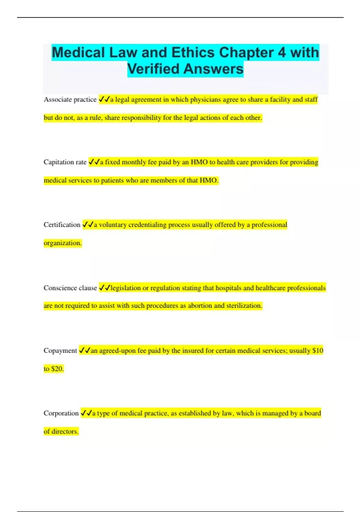 Medical Law and Ethics Chapter 4 with Verified Answers Associate practice a legal agreement in which physicians agree to share a facility and staff but do not, as a rule, share responsibility for the legal actions of each other. Capitation rate a fixed monthly fee paid by an HMO to health care providers for providing medical services to patients who are members of that HMO. Certification a voluntary credentialing process usually offered by a professional organization. Conscience clause legislation or regulation stating that hospitals and healthcare professionals are not required to assist with such procedures as abortion and sterilization. Copayment an agreed-upon fee paid by the insured for certain medical services; usually $10 to $20. Corporation a type of medical practice, as established by law, which is managed by a board of directors. Diagnostic related groups (DRGs) designations used to identify reimbursement per condition in a hospital; used for Medicare patients. Exclusive provider organization (EPO) a type of managed care that combines the concepts of the HMO and PPO. Fee splitting an agreement to pay a fee to another physician or agency for the referral of patients; this is illegal in some states and is considered to be an unethical medical practice. Fixed-payment plan a payment plan for medical bills that offers subscribers (members) complete medical care in return for a fixed monthly fee. Franchise a business run by an individual to whom a franchisor grants the exclusive right to market a product or service in a certain market area. Franchisee person or company who holds a franchise. Gatekeeper the person, such as a primary care physician, or entity, such as an insurance company, that approves patient referrals to other physicians or services. Group practice three or more physicians who share the same facility and practice medicine together. Health Care Quality Improvement Act provides for peer review of physicians by other physicians and healthcare professionals. Health Maintenance Organization (HMO) a type of managed care plan that offers a range of health services to plan members for a predetermined fee per member by a limited group of providers. Indigent a person who is impoverished and without funds. Laws rules or actions prescribed by a governmental authority that have a binding legal force. Licensure a mandatory credentialing process that allows an individual to perform certain skills. Managed care organization (MCO) a type of medical plan that pays for and manages the medical care a patient receives. Medicaid federal program, implemented by the individual states, to provide financial assistance for the indigent. Medicare federal program that provides healthcare coverage for persons over 65 years of age as well as for disabled persons or those who suffer kidney disease or other debilitating ailments. National Practitioners Data Bank (NPDB) a listing of names that assists with peer review of physicians. Partnership a legal agreement in which two or more physicians share the business operation of a medical practice and become responsible for the actions of the other partners. Per diem daily rate Preferred Provider Organization (PPO) a managed care concept in which the patient must use a medical provider who is under contract with the insurer for an agreed-upon fee in order to receive copayment from the insurer. Primary care physician (PCP) HMO-designated physician to manage and control an enrolled patient's medical care. Prospective payment system the payment amount or reimbursement with a set rate for certain procedures is known in advance. Registration indicates that the person whose name is listed on an official record or register has met certain requirements in that particular profession. Sole proprietorship a type of medical practice in which one physician may employ other physicians. Solo practice a medical practice in which the physician works alone. Third-party payers a party other than the patient who assumes responsibility for paying the patient's bills (for example, an insurance company).