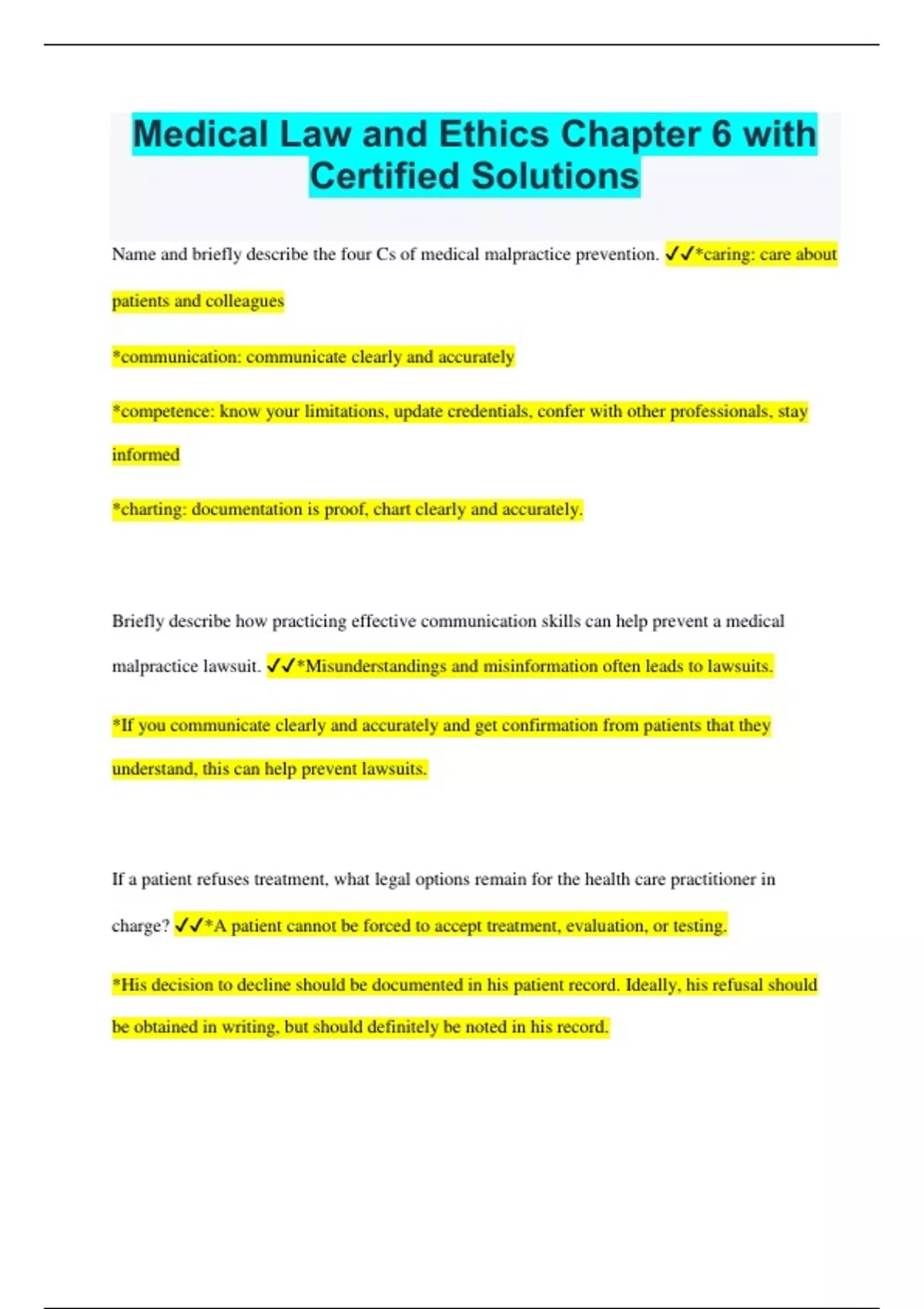 Medical Law and Ethics Chapter 6 with Certified Solutions
