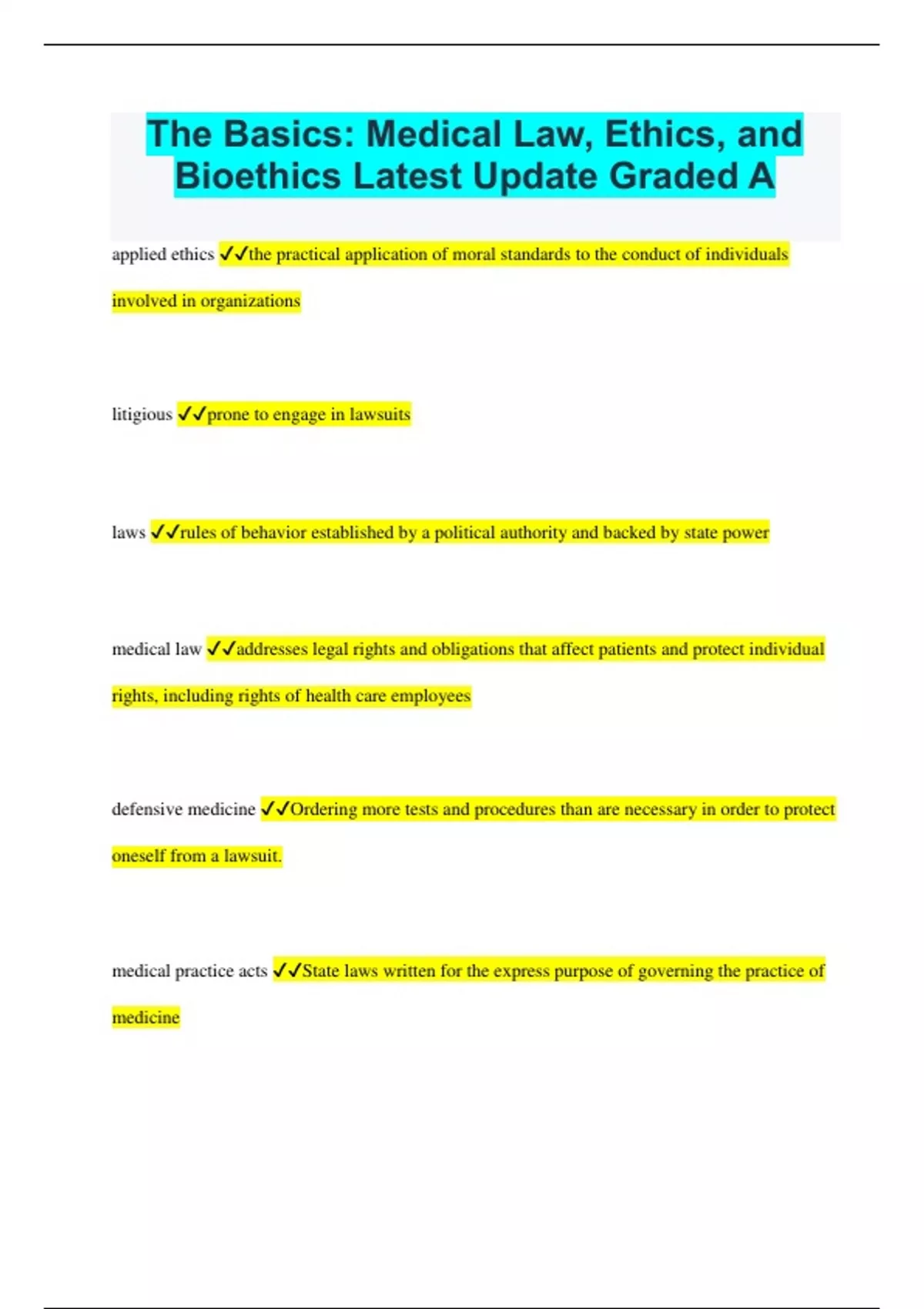 The Basics: Medical Law, Ethics, and Bioethics Latest Update Graded A