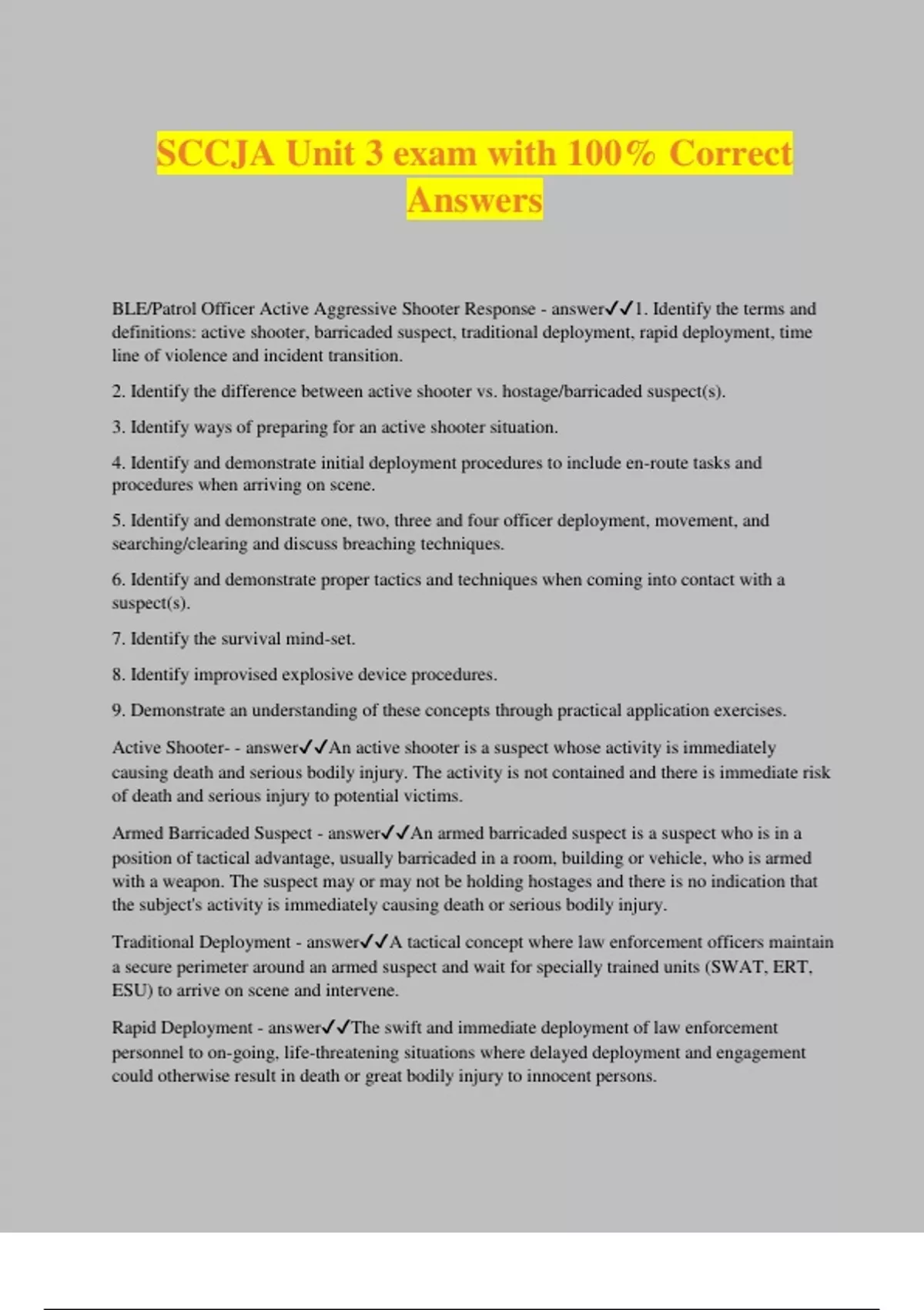 SCCJA Unit 3 exam with 100% Correct Answers BLE/Patrol Officer Active Aggressive Shooter Response - answer1. Identify the terms and definitions: active shooter, barricaded suspect, traditional deployment, rapid deployment, time line of violence and incident transition. 2. Identify the difference between active shooter vs. hostage/barricaded suspect(s). 3. Identify ways of preparing for an active shooter situation. 4. Identify and demonstrate initial deployment procedures to include en-route tasks and procedures when arriving on scene. 5. Identify and demonstrate one, two, three and four officer deployment, movement, and searching/clearing and discuss breaching techniques. 6. Identify and demonstrate proper tactics and techniques when coming into contact with a suspect(s). 7. Identify the survival mind-set. 8. Identify improvised explosive device procedures. 9. Demonstrate an understanding of these concepts through practical application exercises. Active Shooter- - answerAn active shooter is a suspect whose activity is immediately causing death and serious bodily injury. The activity is not contained and there is immediate risk of death and serious injury to potential victims. Armed Barricaded Suspect - answerAn armed barricaded suspect is a suspect who is in a position of tactical advantage, usually barricaded in a room, building or vehicle, who is armed with a weapon. The suspect may or may not be holding hostages and there is no indication that the subject's activity is immediately causing death or serious bodily injury. Traditional Deployment - answerA tactical concept where law enforcement officers maintain a secure perimeter around an armed suspect and wait for specially trained units (SWAT, ERT, ESU) to arrive on scene and intervene. Rapid Deployment - answerThe swift and immediate deployment of law enforcement personnel to on-going, life-threatening situations where delayed deployment and engagement could otherwise result in death or great bodily injury to innocent persons