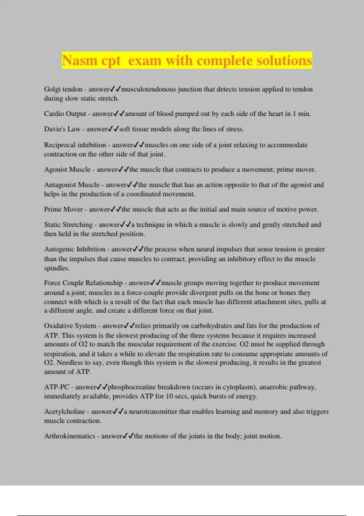 Nasm cpt exam with complete solutions Golgi tendon - answermusculotendonous junction that detects tension applied to tendon during slow static stretch. Cardio Output - answeramount of blood pumped out by each side of the heart in 1 min. Davie's Law - answersoft tissue models along the lines of stress. Reciprocal inhibition - answermuscles on one side of a joint relaxing to accommodate contraction on the other side of that joint. Agonist Muscle - answerthe muscle that contracts to produce a movement; prime mover. Antagonist Muscle - answerthe muscle that has an action opposite to that of the agonist and helps in the production of a coordinated movement. Prime Mover - answerthe muscle that acts as the initial and main source of motive power. Static Stretching - answera technique in which a muscle is slowly and gently stretched and then held in the stretched position. Autogenic Inhibition - answerthe process when neural impulses that sense tension is greater than the impulses that cause muscles to contract, providing an inhibitory effect to the muscle spindles. Force Couple Relationship - answermuscle groups moving together to produce movement around a joint; muscles in a force-couple provide divergent pulls on the bone or bones they connect with which is a result of the fact that each muscle has different attachment sites, pulls at a different angle, and create a different force on that joint. Oxidative System - answerrelies primarily on carbohydrates and fats for the production of ATP. This system is the slowest producing of the three systems because it requires increased amounts of O2 to match the muscular requirement of the exercise. O2 must be supplied through respiration, and it takes a while to elevate the respiration rate to consume appropriate amounts of O2. Needless to say, even though this system is the slowest producing, it results in the greatest amount of ATP.
