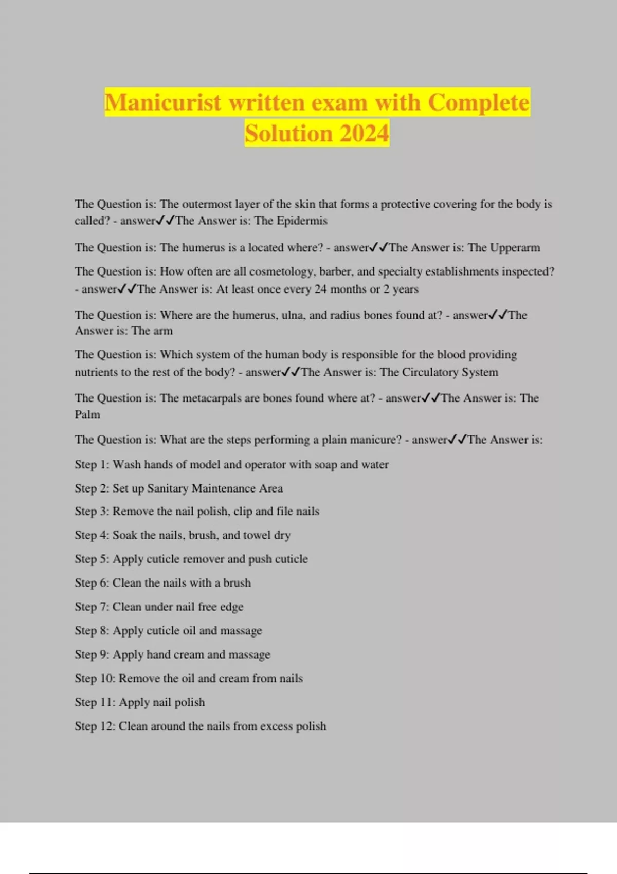 Manicurist written exam with Complete Solution 2024 The Question is: The outermost layer of the skin that forms a protective covering for the body is called? - answerThe Answer is: The Epidermis The Question is: The humerus is a located where? - answerThe Answer is: The Upperarm The Question is: How often are all cosmetology, barber, and specialty establishments inspected? - answerThe Answer is: At least once every 24 months or 2 years The Question is: Where are the humerus, ulna, and radius bones found at? - answerThe Answer is: The arm The Question is: Which system of the human body is responsible for the blood providing nutrients to the rest of the body? - answerThe Answer is: The Circulatory System The Question is: The metacarpals are bones found where at? - answerThe Answer is: The Palm The Question is: What are the steps performing a plain manicure? - answerThe Answer is: Step 1: Wash hands of model and operator with soap and water Step 2: Set up Sanitary Maintenance Area Step 3: Remove the nail polish, clip and file nails Step 4: Soak the nails, brush, and towel dry Step 5: Apply cuticle remover and push cuticle Step 6: Clean the nails with a brush Step 7: Clean under nail free edge Step 8: Apply cuticle oil and massage Step 9: Apply hand cream and massage Step 10: Remove the oil and cream from nails Step 11: Apply nail polish Step 12: Clean around the nails from excess polish Step 13: Clean up area The Question is: Where is the radius located at? - answerThe Answer is: The forearm The Question is: What is not prohibited in the cosmetology industry? - answerThe Answer is: Talking to clients about services needed The Question is: The portion of the skin in which the nail root rest is called? - answerThe Answer is: The Nail Plate The Question is: The ability of the body to destroy any bacteria that have gained entrance and to resist infection in general is referred to as? - answerThe Answer is: Immunity The Question is: Where do the nail plate grown from nail root rest at? - answerThe Answer is: The nail b