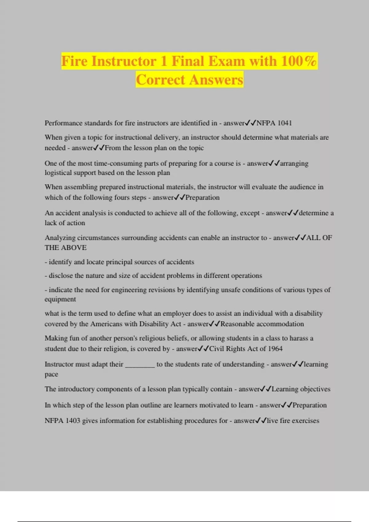 Fire Instructor 1 Final Exam with 100% Correct Answers Performance standards for fire instructors are identified in - answerNFPA 1041 When given a topic for instructional delivery, an instructor should determine what materials are needed - answerFrom the lesson plan on the topic One of the most time-consuming parts of preparing for a course is - answerarranging logistical support based on the lesson plan When assembling prepared instructional materials, the instructor will evaluate the audience in which of the following fours steps - answerPreparation An accident analysis is conducted to achieve all of the following, except - answerdetermine a lack of action Analyzing circumstances surrounding accidents can enable an instructor to - answerALL OF THE ABOVE - identify and locate principal sources of accidents - disclose the nature and size of accident problems in different operations - indicate the need for engineering revisions by identifying unsafe conditions of various types of equipment what is the term used to define what an employer does to assist an individual with a disability covered by the Americans with Disability Act - answerReasonable accommodation Making fun of another person's religious beliefs, or allowing students in a class to harass a student due to their religion, is covered by - answerCivil Rights Act of 1964 Instructor must adapt their ________ to the students rate of understanding - answerlearning pace The introductory components of a lesson plan typically contain - answerLearning objectives In which step of the lesson plan outline are learners motivated to learn - answerPreparation NFPA 1403 gives information for establishing procedures for - answerlive fire exercises When collecting information and materials for use in a presentation, the instructor should - answercite all sources in case someone challenges him or her An important part of a lesson plan that indicates for whom the lesson plan was developed is the - answerlevel of instruction The purpose of the presentation step of the instructional process is to - answerPresent new skills and concepts Directions: Read the following statements regarding instructors, then select your answer - answerINSTRUCTORS LEAD OR GUIDE LEARNERS THROUGH A CLASS INSTRUCTORS MUST HAVE A DESIRE TO UNDERSTAND THE NEEDS OF LEARNERS which of the flowing statements IS NOT TRUE regarding the functions of a lesson plan - answerthey are a rigid procedure that must be followed for successful teaching The law of _____ states that no one will ever become proficient at any skill without performing the operation - answerExercise Which of the following is a good seating arrangement when instruction a class composed of a small discussion group - answerHollow square or roun