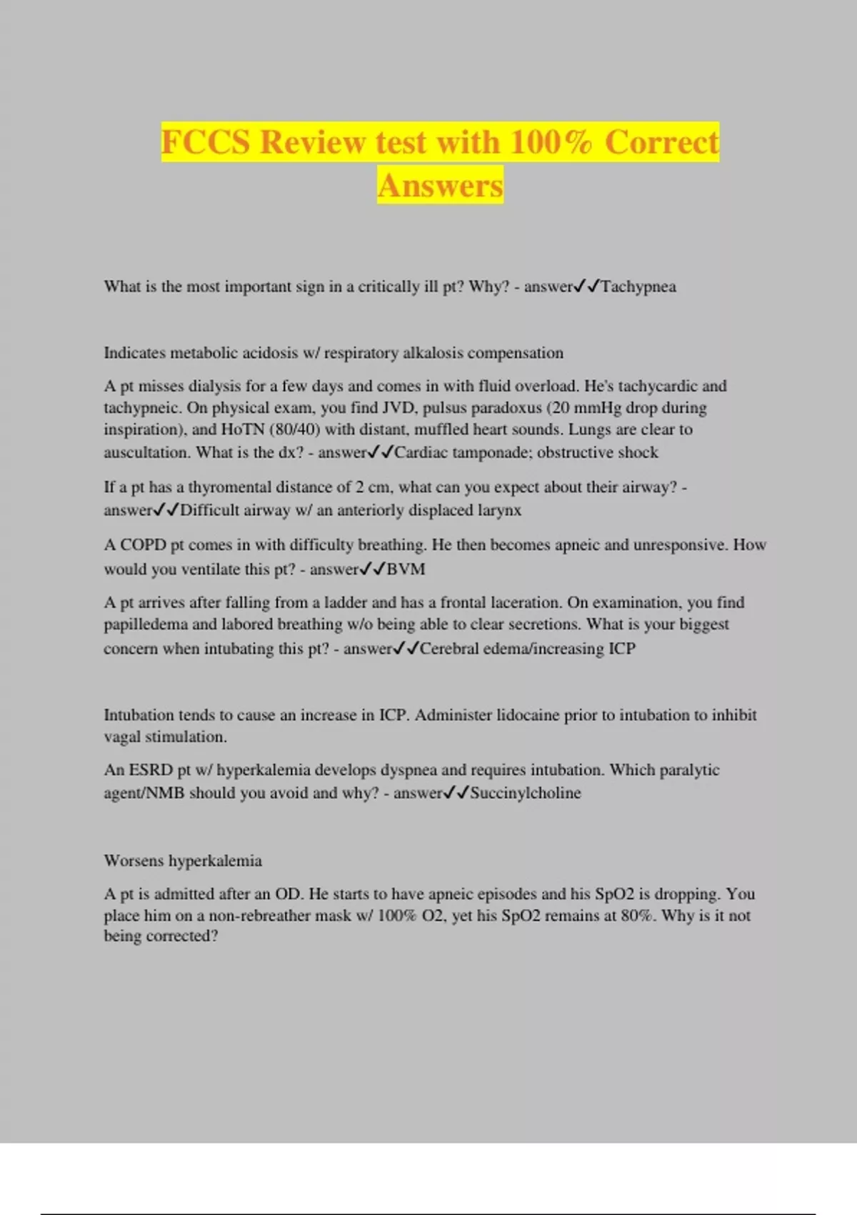 FCCS Review test with 100% Correct Answers What is the most important sign in a critically ill pt? Why? - answerTachypnea Indicates metabolic acidosis w/ respiratory alkalosis compensation A pt misses dialysis for a few days and comes in with fluid overload. He's tachycardic and tachypneic. On physical exam, you find JVD, pulsus paradoxus (20 mmHg drop during inspiration), and HoTN (80/40) with distant, muffled heart sounds. Lungs are clear to auscultation. What is the dx? - answerCardiac tamponade; obstructive shock If a pt has a thyromental distance of 2 cm, what can you expect about their airway? - answerDifficult airway w/ an anteriorly displaced larynx A COPD pt comes in with difficulty breathing. He then becomes apneic and unresponsive. How would you ventilate this pt? - answerBVM A pt arrives after falling from a ladder and has a frontal laceration. On examination, you find papilledema and labored breathing w/o being able to clear secretions. What is your biggest concern when intubating this pt? - answerCerebral edema/increasing ICP Intubation tends to cause an increase in ICP. Administer lidocaine prior to intubation to inhibit vagal stimulation. An ESRD pt w/ hyperkalemia develops dyspnea and requires intubation. Which paralytic agent/NMB should you avoid and why? - answerSuccinylcholine Worsens hyperkalemia A pt is admitted after an OD. He starts to have apneic episodes and his SpO2 is dropping. You place him on a non-rebreather mask w/ 100% O2, yet his SpO2 remains at 80%. Why is it not being corrected? Then, if you try a BVM and it also fails, and video laryngoscopy is unavailable, what is your next best choice for an airway? - answerThe pt is having apneic episodes, which means that administering high-flow O2 will be ineffecti