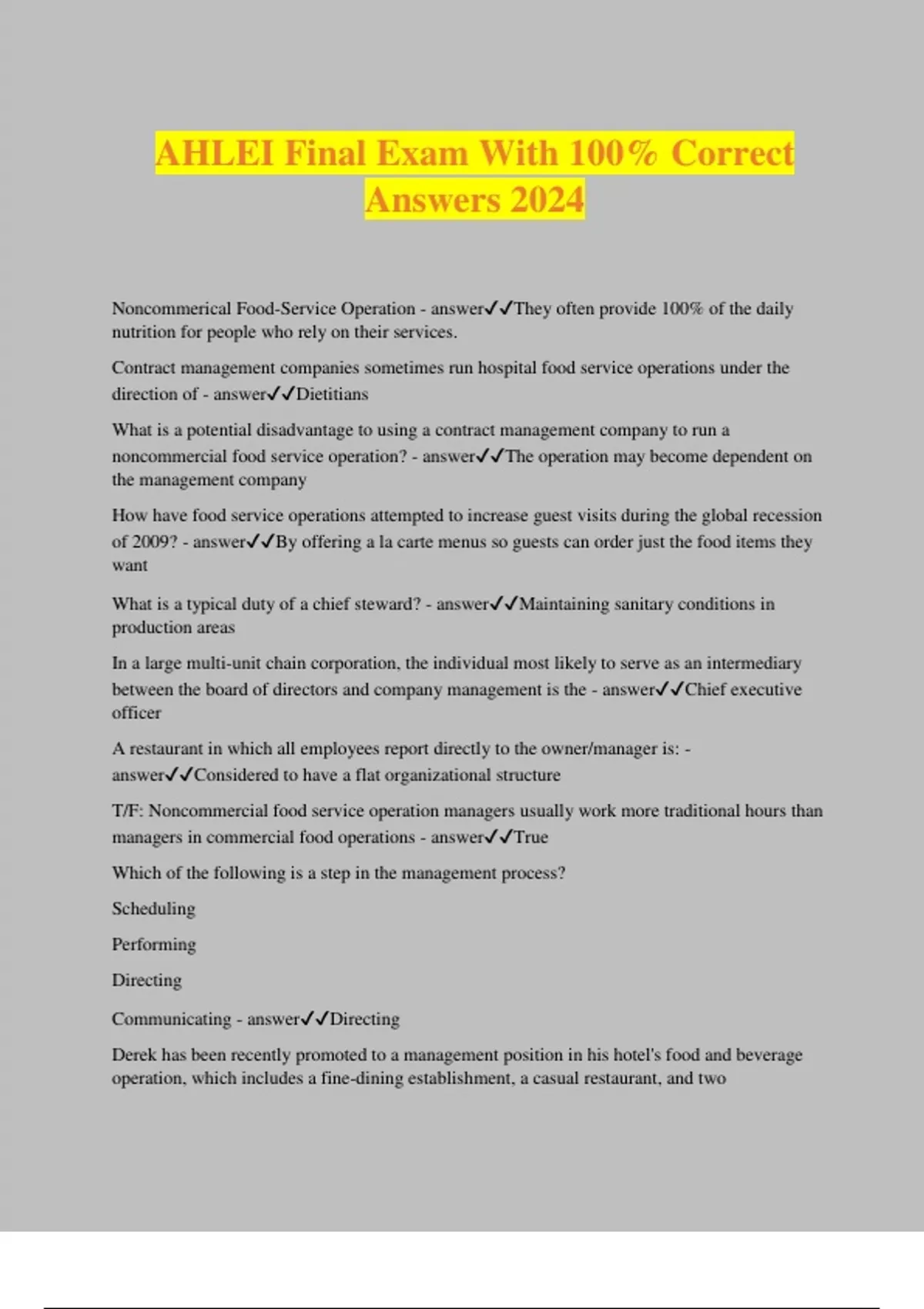 AHLEI Final Exam With 100% Correct Answers 2024 Noncommerical Food-Service Operation - answerThey often provide 100% of the daily nutrition for people who rely on their services. Contract management companies sometimes run hospital food service operations under the direction of - answerDietitians What is a potential disadvantage to using a contract management company to run a noncommercial food service operation? - answerThe operation may become dependent on the management company How have food service operations attempted to increase guest visits during the global recession of 2009? - answerBy offering a la carte menus so guests can order just the food items they want What is a typical duty of a chief steward? - answerMaintaining sanitary conditions in production areas In a large multi-unit chain corporation, the individual most likely to serve as an intermediary between the board of directors and company management is the - answerChief executive officer A restaurant in which all employees report directly to the owner/manager is: - answerConsidered to have a flat organizational structure T/F: Noncommercial food service operation managers usually work more traditional hours than managers in commercial food operations - answerTrue Which of the following is a step in the management process? Scheduling Performing Directing Communicating - answerDirecting
