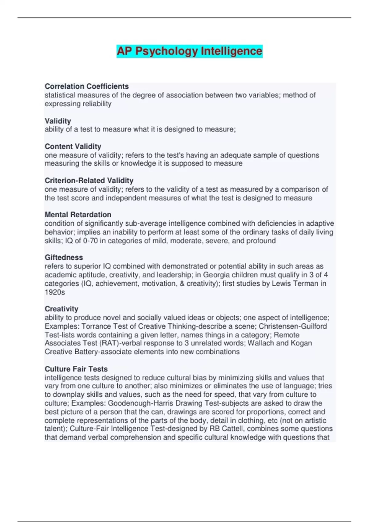 AP Psychology Intelligence Terminology Correlation Coefficients statistical measures of the degree of association between two variables; method of expressing reliability Validity ability of a test to measure what it is designed to measure; Content Validity one measure of validity; refers to the test's having an adequate sample of questions measuring the skills or knowledge it is supposed to measure Criterion-Related Validity one measure of validity; refers to the validity of a test as measured by a comparison of the test score and independent measures of what the test is designed to measure Mental Retardation condition of significantly sub-average intelligence combined with deficiencies in adaptive behavior; implies an inability to perform at least some of the ordinary tasks of daily living skills; IQ of 0-70 in categories of mild, moderate, severe, and profound Giftedness refers to superior IQ combined with demonstrated or potential ability in such areas as academic aptitude, creativity, and leadership; in Georgia children must qualify in 3 of 4 categories (IQ, achievement, motivation, & creativity); first studies by Lewis Terman in 1920s Creativity ability to produce novel and socially valued ideas or objects; one aspect of intelligence; Examples: Torrance Test of Creative Thinking-describe a scene; Christensen-Guilford Test-lists words containing a given letter, names things in a category; Remote Associates Test (RAT)-verbal response to 3 unrelated words; Wallach and Kogan Creative Battery-associate elements into new combinations Culture Fair Tests intelligence tests designed to reduce cultural bias by minimizing skills and values that vary from one culture to another; also minimizes or eliminates the use of language; tries to downplay skills and values, such as the need for speed, that vary from culture to culture; Examples: Goodenough-Harris Drawing Test-subjects are asked to draw the best picture of a person that the can, drawings are scored for proportions, correct and complete representations of the parts of the body, detail in clothing, etc (not on artistic talent); Culture-Fair Intelligence Test-designed by RB Cattell, combines some questions that demand verbal comprehension and specific cultural knowledge with questions that