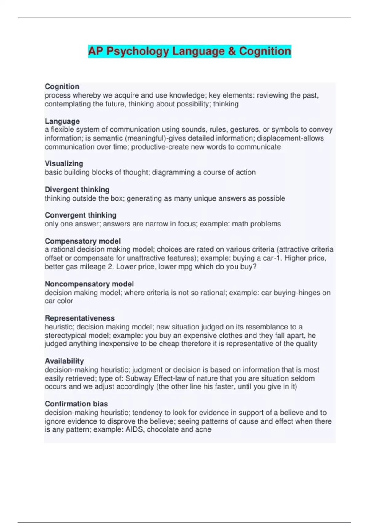 AP Psychology Language & Cognition Terminology Cognition process whereby we acquire and use knowledge; key elements: reviewing the past, contemplating the future, thinking about possibility; thinking Language a flexible system of communication using sounds, rules, gestures, or symbols to convey information; is semantic (meaningful)-gives detailed information; displacement-allows communication over time; productive-create new words to communicate Visualizing basic building blocks of thought; diagramming a course of action Divergent thinking thinking outside the box; generating as many unique answers as possible Convergent thinking only one answer; answers are narrow in focus; example: math problems Compensatory model a rational decision making model; choices are rated on various criteria (attractive criteria offset or compensate for unattractive features); example: buying a car-1. Higher price, better gas mileage 2. Lower price, lower mpg which do you buy? Noncompensatory model decision making model; where criteria is not so rational; example: car buying-hinges on car color Representativeness heuristic; decision making model; new situation judged on its resemblance to a stereotypical model; example: you buy an expensive clothes and they fall apart, he judged anything inexpensive to be cheap therefore it is representative of the quality Availability decision-making heuristic; judgment or decision is based on information that is most easily retrieved; type of: Subway Effect-law of nature that you are situation seldom occurs and we adjust accordingly (the other line his faster, until you give in it) Confirmation bias decision-making heuristic; tendency to look for evidence in support of a believe and to ignore evidence to disprove the believe; seeing patterns of cause and effect when there is any pattern; example: AIDS, chocolate and acne