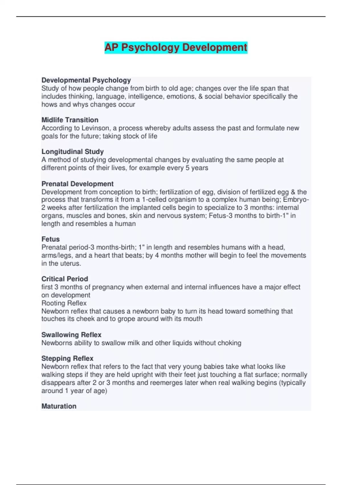 AP Psychology Development Terminology Developmental Psychology Study of how people change from birth to old age; changes over the life span that includes thinking, language, intelligence, emotions, & social behavior specifically the hows and whys changes occur Midlife Transition According to Levinson, a process whereby adults assess the past and formulate new goals for the future; taking stock of life Longitudinal Study A method of studying developmental changes by evaluating the same people at different points of their lives, for example every 5 years Prenatal Development Development from conception to birth; fertilization of egg, division of fertilized egg & the process that transforms it from a 1-celled organism to a complex human being; Embryo-2 weeks after fertilization the implanted cells begin to specialize to 3 months: internal organs, muscles and bones, skin and nervous system; Fetus-3 months to birth-1" in length and resembles a human Fetus Prenatal period-3 months-birth; 1" in length and resembles humans with a head, arms/legs, and a heart that beats; by 4 months mother will begin to feel the movements in the uterus. Critical Period first 3 months of pregnancy when external and internal influences have a major effect on development Rooting Reflex Newborn reflex that causes a newborn baby to turn its head toward something that touches its cheek and to grope around with its mouth Swallowing Reflex Newborns ability to swallow milk and other liquids without choking Stepping Reflex Newborn reflex that refers to the fact that very young babies take what looks like walking steps if they are held upright with their feet just touching a flat surface; normally disappears after 2 or 3 months and reemerges later when real walking begins (typically around 1 year of age)