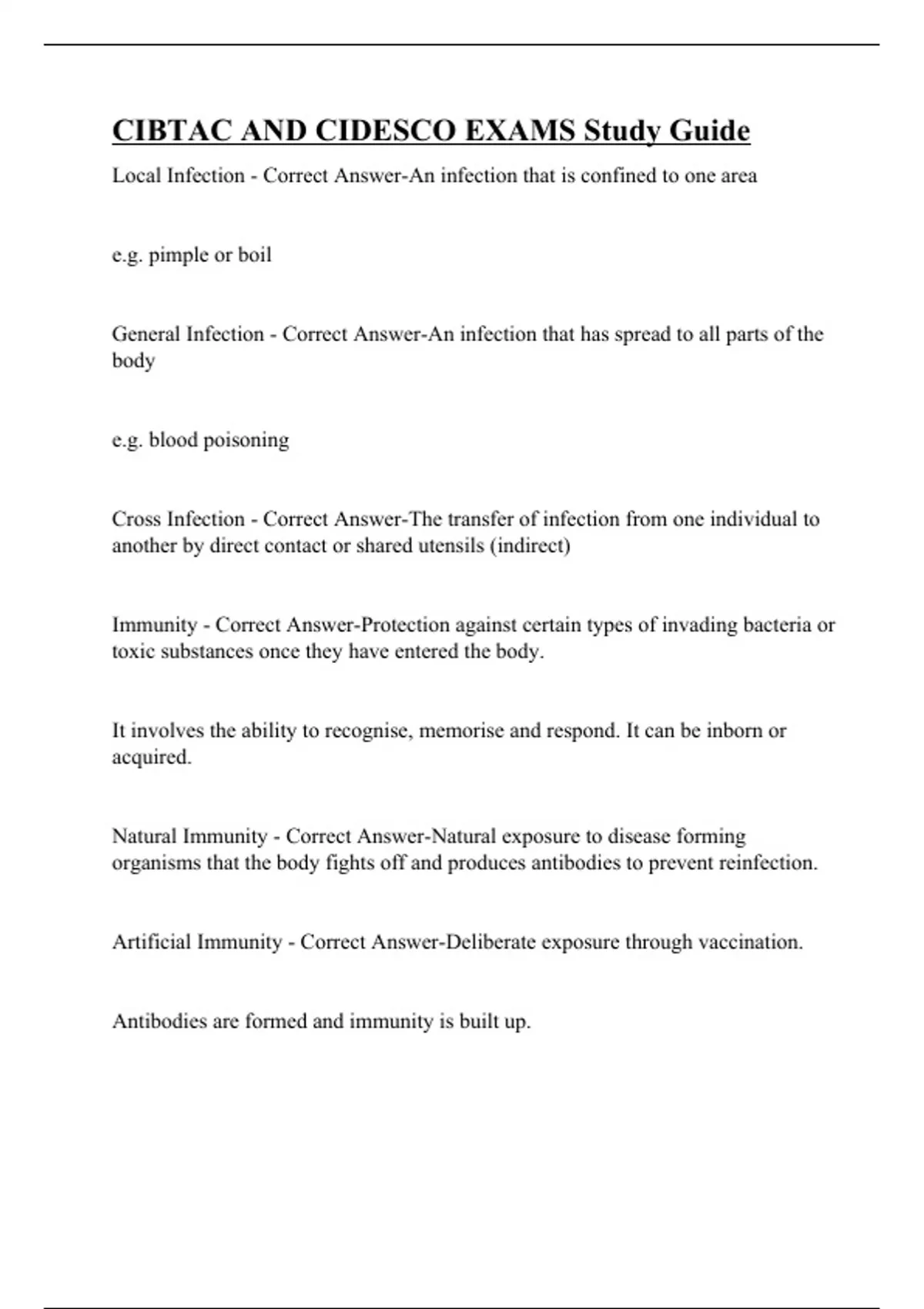 Local Infection - Correct Answer-An infection that is confined to one area e.g. pimple or boil General Infection - Correct Answer-An infection that has spread to all parts of the body e.g. blood poisoning Cross Infection - Correct Answer-The transfer of infection from one individual to another by direct contact or shared utensils (indirect) Immunity - Correct Answer-Protection against certain types of invading bacteria or toxic substances once they have entered the body. It involves the ability to recognise, memorise and respond. It can be inborn or acquired. Natural Immunity - Correct Answer-Natural exposure to disease forming organisms that the body fights off and produces antibodies to prevent reinfection. Artificial Immunity - Correct Answer-Deliberate exposure through vaccination. Antibodies are formed and immunity is built up.