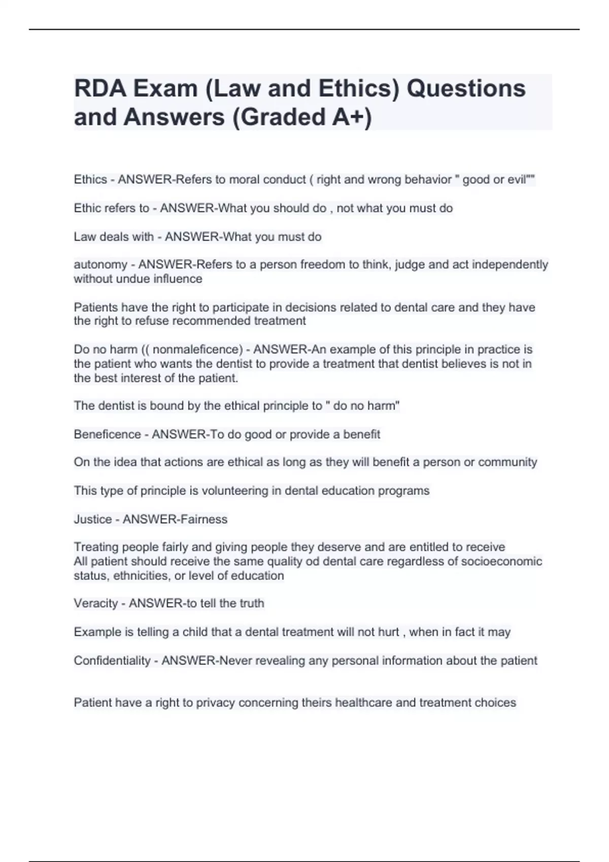 Ethics - ANSWER-Refers to moral conduct ( right and wrong behavior " good or evil"" Ethic refers to - ANSWER-What you should do , not what you must do Law deals with - ANSWER-What you must do autonomy - ANSWER-Refers to a person freedom to think, judge and act independently without undue influence Patients have the right to participate in decisions related to dental care and they have the right to refuse recommended treatment Do no harm (( nonmaleficence) - ANSWER-An example of this principle in practice is the patient who wants the dentist to provide a treatment that dentist believes is not in the best interest of the patient. The dentist is bound by the ethical principle to " do no harm" Beneficence - ANSWER-To do good or provide a benefit On the idea that actions are ethical as long as they will benefit a person or community This type of principle is volunteering in dental education programs Justice - ANSWER-Fairness Treating people fairly and giving people they deserve and are entitled to receive All patient should receive the same quality od dental care regardless of socioeconomic status, ethnicities, or level of education Veracity - ANSWER-to tell the truth Example is telling a child that a dental treatment will not hurt , when in fact it may Confidentiality - ANSWER-Never revealing any personal information about the patient Patient have a right to privacy concerning theirs healthcare and treatment choices HIPPA - ANSWER-Health Insurance Portability and Accountability Act ( 1996)) code of ethics - ANSWER-To demonstrate the standard of care that public can expect from their members To enhance the ethical consciousness and ethical responsibility of their member To guide members in making informed ethical decisions Establish a standard for professional judgement and conduct Woman choose not to take dental radiographs because she is afraid of radiation exposure - ANSWER-Dentist is facing an ethical dilemma that involves the principle of AUTONOMY Several dental assistants like gossiping about the receptionist, by refusing to participate in office gossip - ANSWER-You're applying the principle of NON MALEFICENCE ( do
