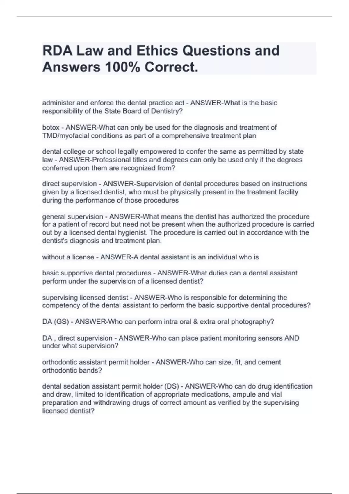 RDA Law and Ethics Questions and Answers 100% Correct. RDA Law and Ethics Questions and Answers 100% Correct. RDA Law and Ethics Questions and Answers 100% Correct. RDA Law and Ethics Questions and Answers 100% Correct. RDA Law and Ethics Questions and Answers 100% Correct. RDA Law and Ethics Questions and Answers 100% Correct. RDA Law and Ethics Questions and Answers 100% Correct. RDA Law and Ethics Questions and Answers 100% Correct. RDA Law and Ethics Questions and Answers 100% Correct.