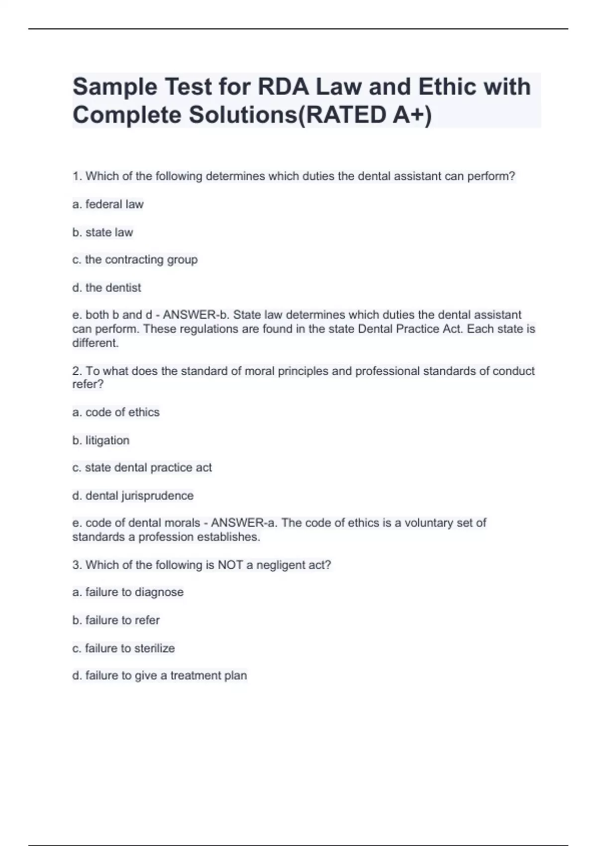 Sample Test for RDA Law and Ethic with Complete Solutions(RATED A+)