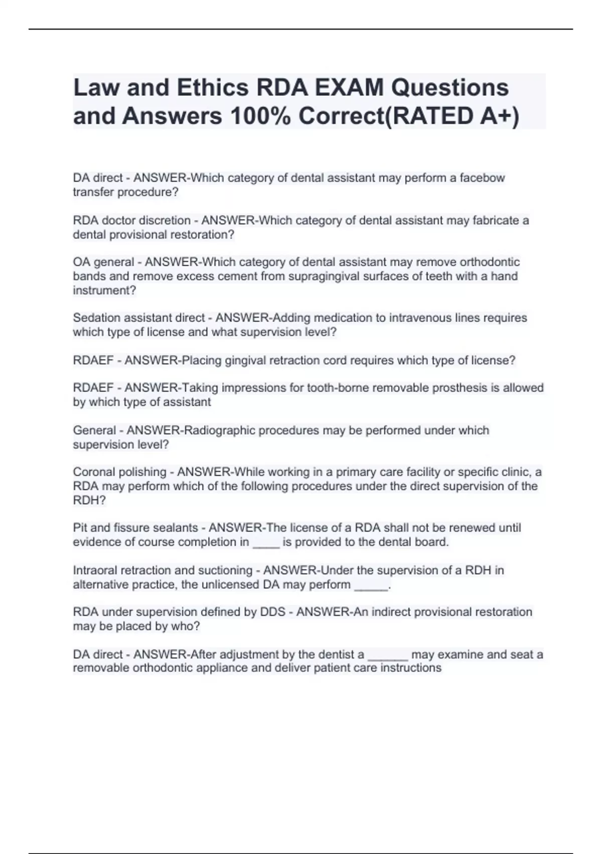 Law and Ethics RDA EXAM Questions and Answers 100% Correct(RATED A+) Law and Ethics RDA EXAM Questions and Answers 100% Correct(RATED A+) Law and Ethics RDA EXAM Questions and Answers 100% Correct(RATED A+) Law and Ethics RDA EXAM Questions and Answers 100% Correct(RATED A+) Law and Ethics RDA EXAM Questions and Answers 100% Correct(RATED A+) Law and Ethics RDA EXAM Questions and Answers 100% Correct(RATED A+) Law and Ethics RDA EXAM Questions and Answers 100% Correct(RATED A+) Law and Ethics RDA EXAM Questions and Answers 100% Correct(RATED A+)