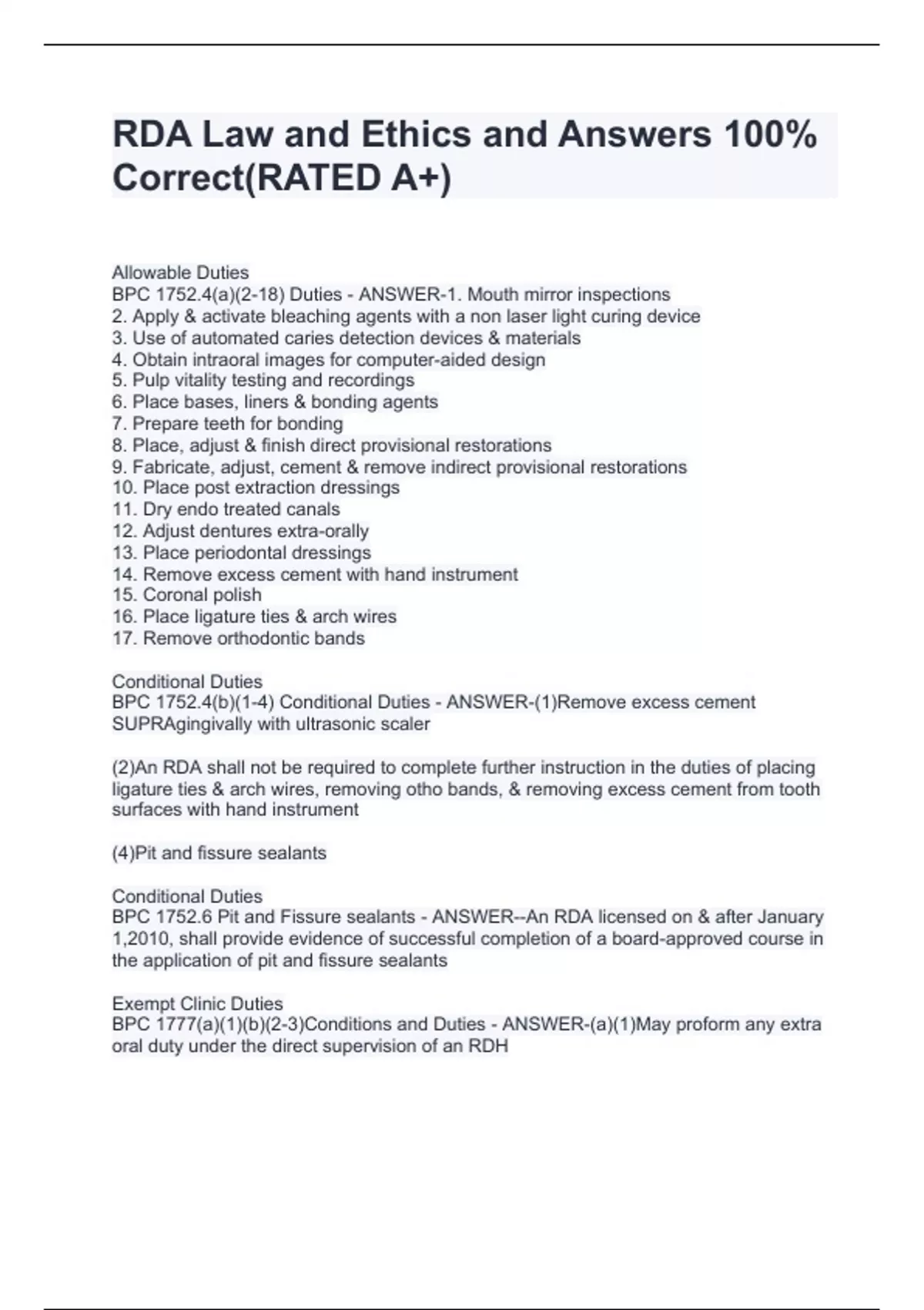 RDA Law and Ethics and Answers 100% Correct(RATED A+)