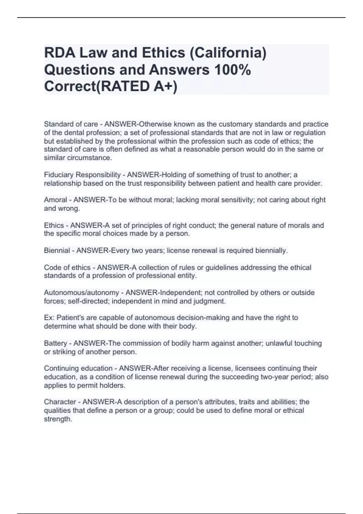 RDA Law and Ethics (California) Questions and Answers 100% Correct(RATED A+) RDA Law and Ethics (California) Questions and Answers 100% Correct(RATED A+) RDA Law and Ethics (California) Questions and Answers 100% Correct(RATED A+) RDA Law and Ethics (California) Questions and Answers 100% Correct(RATED A+) RDA Law and Ethics (California) Questions and Answers 100% Correct(RATED A+) RDA Law and Ethics (California) Questions and Answers 100% Correct(RATED A+) RDA Law and Ethics (California) Questions and Answers 100% Correct(RATED A+) RDA Law and Ethics (California) Questions and Answers 100% Correct(RATED A+) RDA Law and Ethics (California) Questions and Answers 100% Correct(RATED A+) RDA Law and Ethics (California) Questions and Answers 100% Correct(RATED A+) RDA Law and Ethics (California) Questions and Answers 100% Correct(RATED A+)