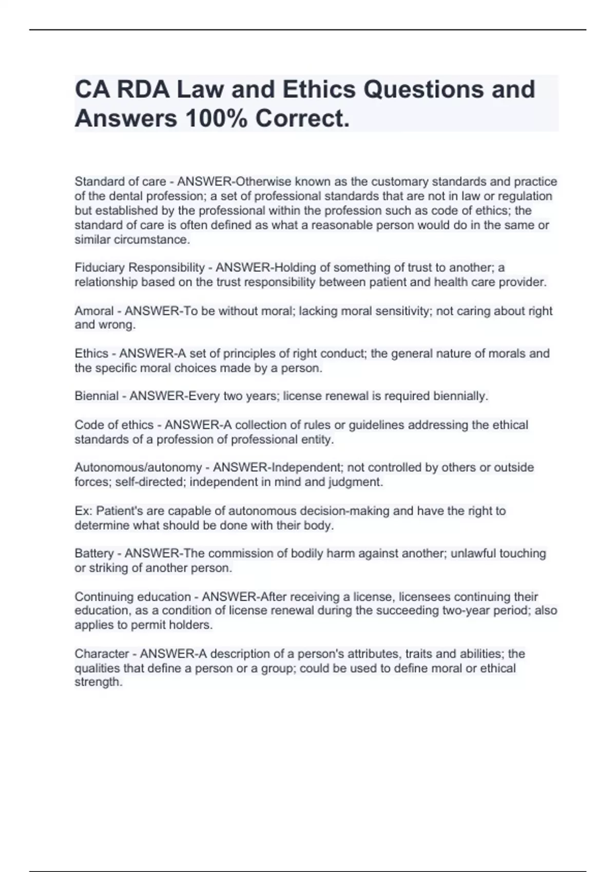 CA RDA Law and Ethics Questions and Answers 100% Correct.CA RDA Law and Ethics Questions and Answers 100% Correct.CA RDA Law and Ethics Questions and Answers 100% Correct.CA RDA Law and Ethics Questions and Answers 100% Correct.CA RDA Law and Ethics Questions and Answers 100% Correct.CA RDA Law and Ethics Questions and Answers 100% Correct.CA RDA Law and Ethics Questions and Answers 100% Correct.CA RDA Law and Ethics Questions and Answers 100% Correct.CA RDA Law and Ethics Questions and Answers 100% Correct.CA RDA Law and Ethics Questions and Answers 100% Correct.
