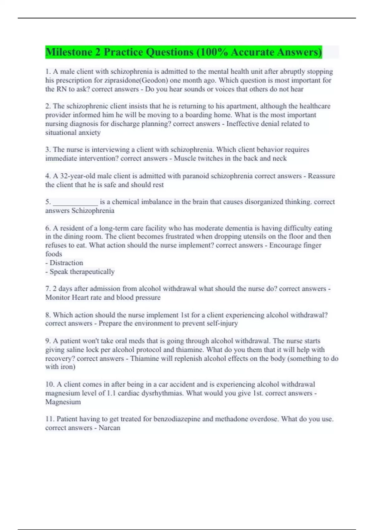 1. A male client with schizophrenia is admitted to the mental health unit after abruptly stopping his prescription for ziprasidone(Geodon) one month ago. Which question is most important for the RN to ask? correct answers - Do you hear sounds or voices that others do not hear 2. The schizophrenic client insists that he is returning to his apartment, although the healthcare provider informed him he will be moving to a boarding home. What is the most important nursing diagnosis for discharge planning? correct answers - Ineffective denial related to situational anxiety 3. The nurse is interviewing a client with schizophrenia. Which client behavior requires immediate intervention? correct answers - Muscle twitches in the back and neck 4. A 32-year-old male client is admitted with paranoid schizophrenia correct answers - Reassure the client that he is safe and should rest 5. ____________ is a chemical imbalance in the brain that causes disorganized thinking. correct answers Schizophrenia 6. A resident of a long-term care facility who has moderate dementia is having difficulty eating in the dining room. The client becomes frustrated when dropping utensils on the floor and then refuses to eat. What action should the nurse implement? correct answers - Encourage finger foods - Distraction - Speak therapeutically 7. 2 days after admission from alcohol withdrawal what should the nurse do? correct answers - Monitor Heart rate and blood pressure 8. Which action should the nurse implement 1st for a client experiencing alcohol withdrawal? correct answers - Prepare the environment to prevent self-injury 9. A patient won't take oral meds that is going through alcohol withdrawal. The nurse starts giving saline lock per alcohol protocol and thiamine. What do you them that it will help with recovery? correct answers - Thiamine will replenish alcohol effects on the body (something to do with iron) 10. A client comes in after being in a car accident and is experiencing alcohol withdrawal magnesium level of 1.1 cardiac dysrhythmias. What would you give 1st. correct answers - Magnesium 11. Patient having to get treated for benzodiazepine and methadone overdose. What do you use. correct answers - Narcan