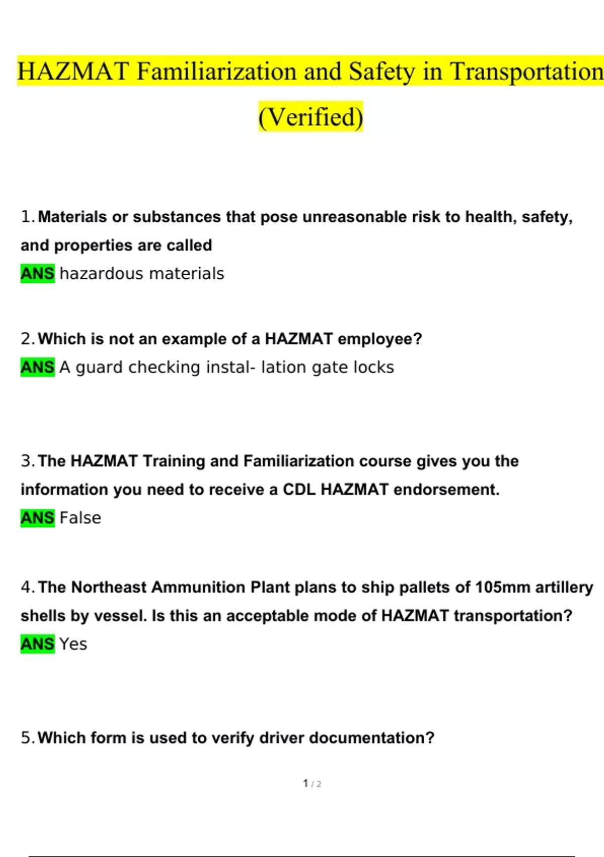 HAZMAT Familiarization and Safety in Transportation Questions and Answers (2024 / 2025) (Verified Answers)HAZMAT Familiarization and Safety in Transportation Questions and Answers (2024 / 2025) (Verified Answers)HAZMAT Familiarization and Safety in Transportation Questions and Answers (2024 / 2025) (Verified Answers)HAZMAT Familiarization and Safety in Transportation Questions and Answers (2024 / 2025) (Verified Answers)